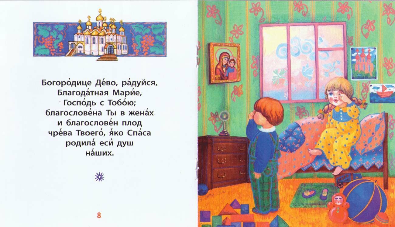 Купила именно этот молитвослов маленькому сыну, тк иллюстрации в книжечке не абстрактные, не высокопарные, не оторванные от земли, а вполне реальные, наполненные предметами, которые ребенок каждый день видит вокруг себя. И в то же время молитвослов возвышенный: на каждом развороте есть церкви или иконы. Ребенок очень любит эту небольшую теплую книжечку.