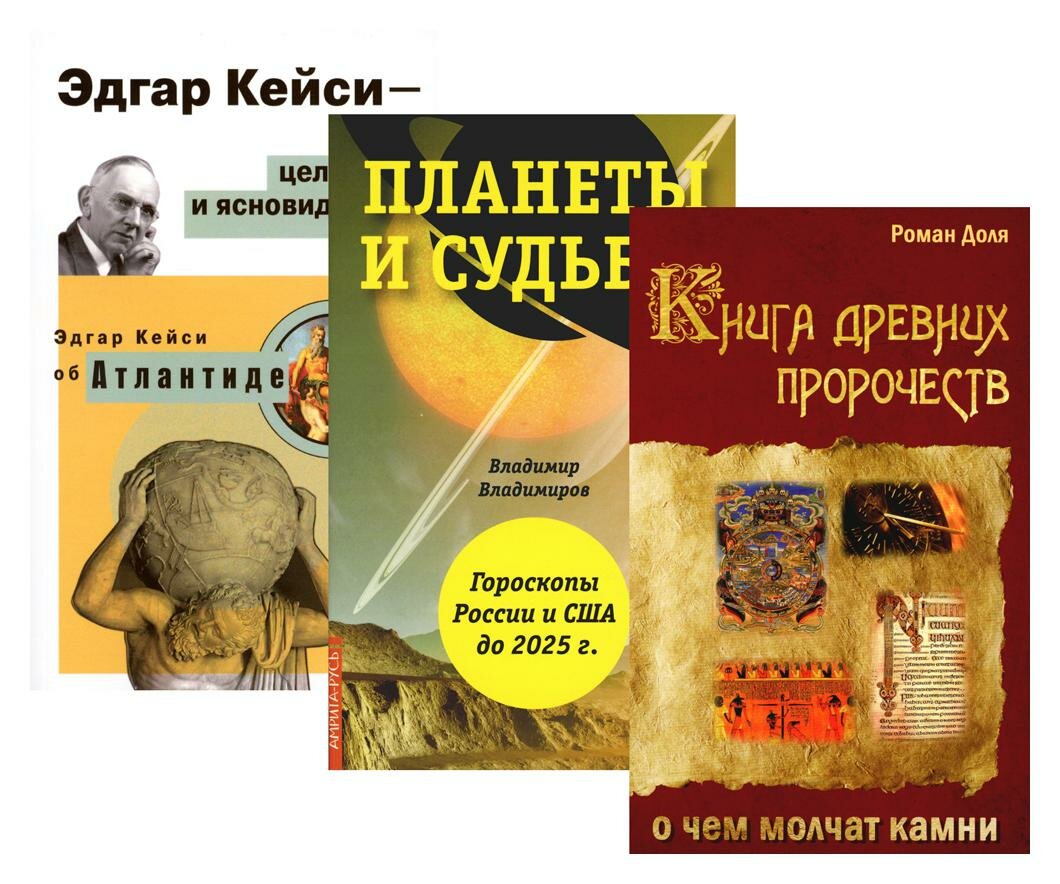 «Ну что сказать, ну что сказать, устроены так люди, желают знать, желают знать, желают знать что будет…» – эти слова из популярной песни как нельзя лучше характеризуют стремление человека заглянуть за воображающую грань, отделяющую настоящее от будущего. Астрология – это древняя и мудрая наука, в основе которой лежат до конца не разгаданные закономерности, связанные с влиянием небесных тел на жизнь людей. Предлагаемые вашему вниманию книги содержат в себе уникальную информацию, связанную с прогнозами и предсказаниями будущего, сделанными великим американским пророком Эдгаром Кейси и талантливым российским астрологом Владимиром Владимировым. В наборе также книга Романа Доли о древних пророчествах. Эта информация позволит вам лучше ориентироваться в бушующем океане современной жизни и найти путь к тихой гавани спокойствия и благополучия.