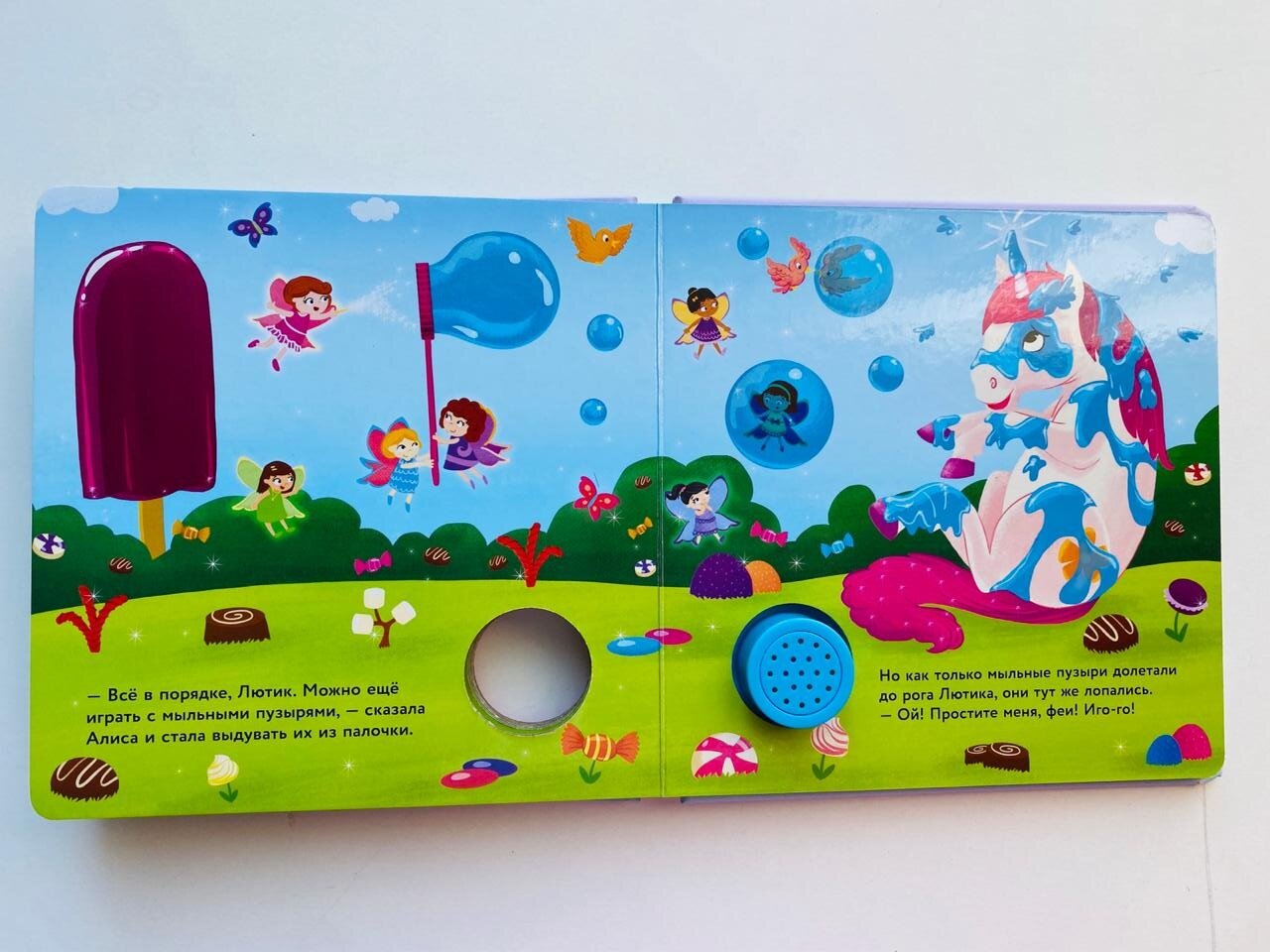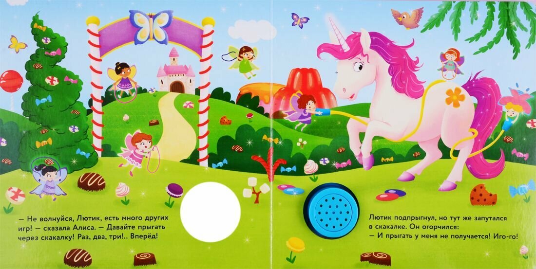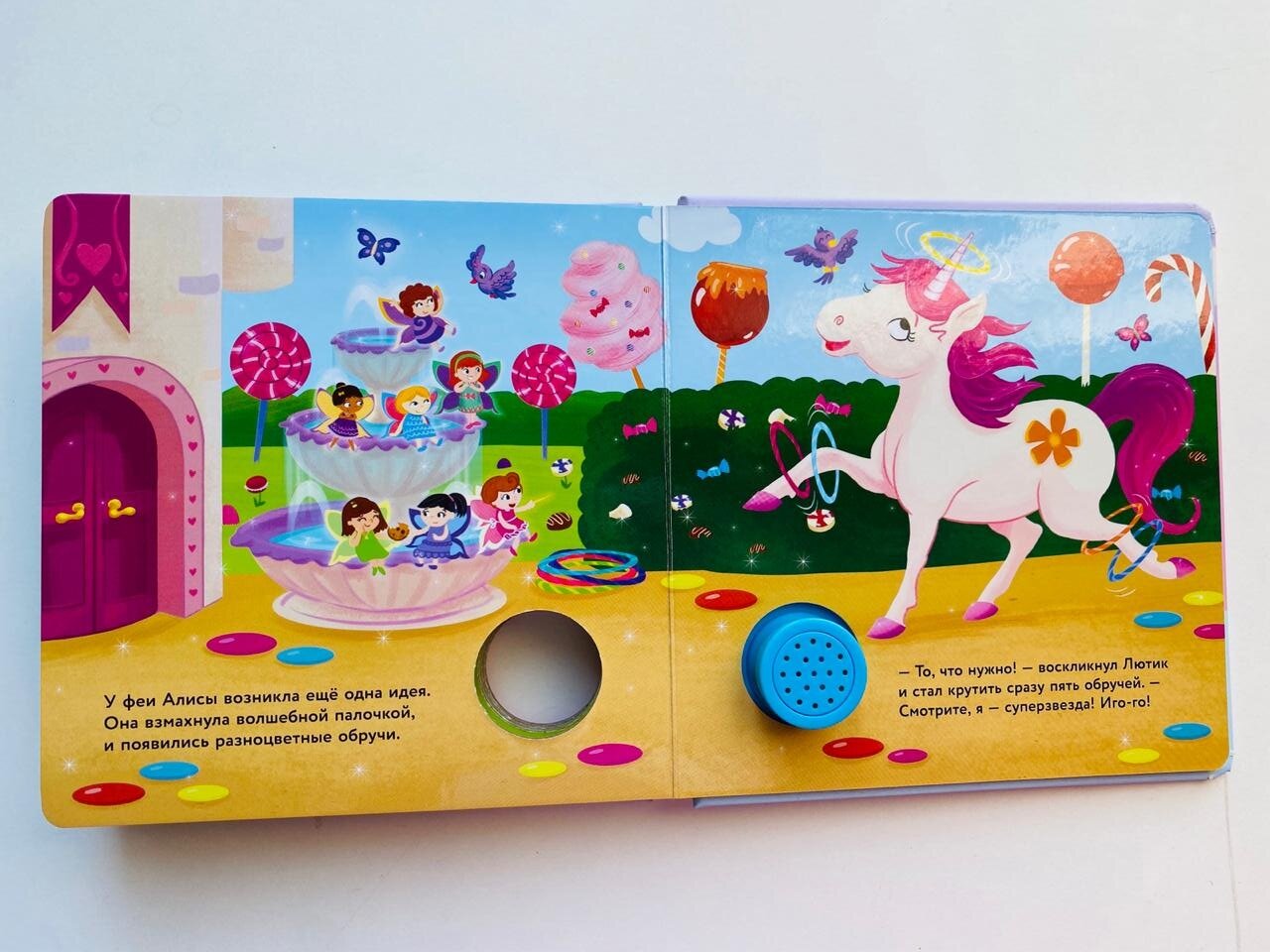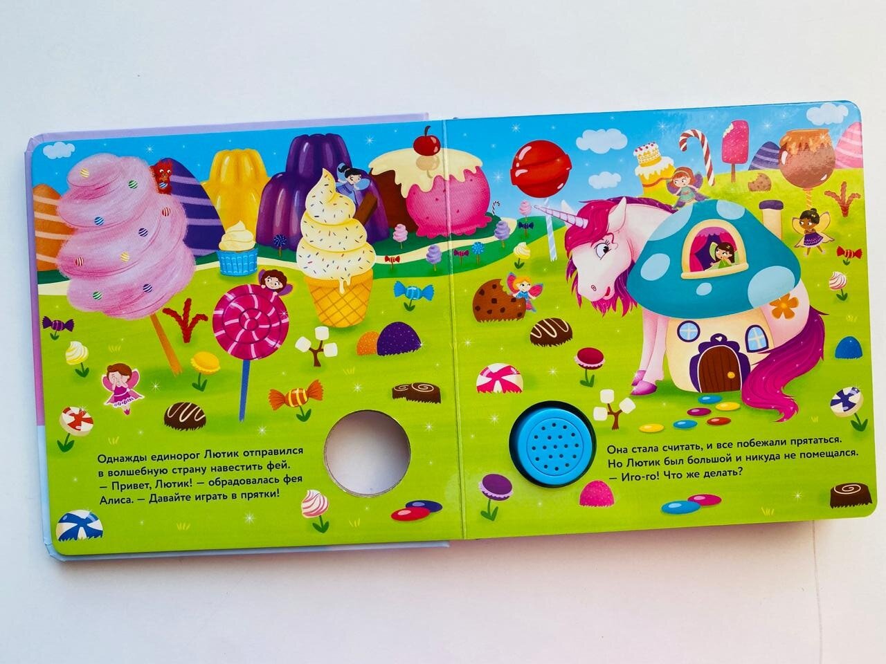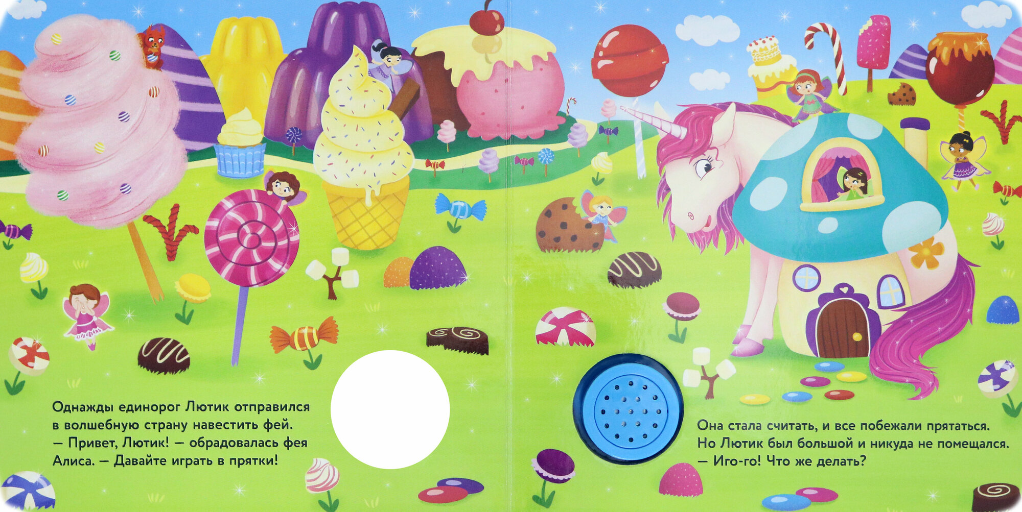 В этой книжке единорог Лютик отправиться в гости к своим подружкам феям. Они будут искать игру, в которую можно играть всем вместе. Нажимай на кнопку, и услышишь голос единорога. Иго-го!