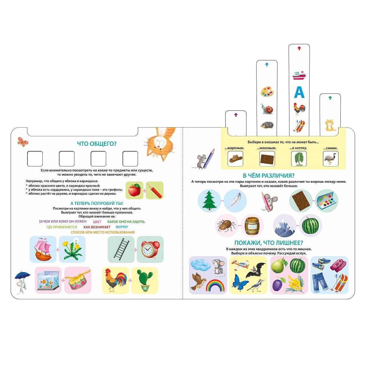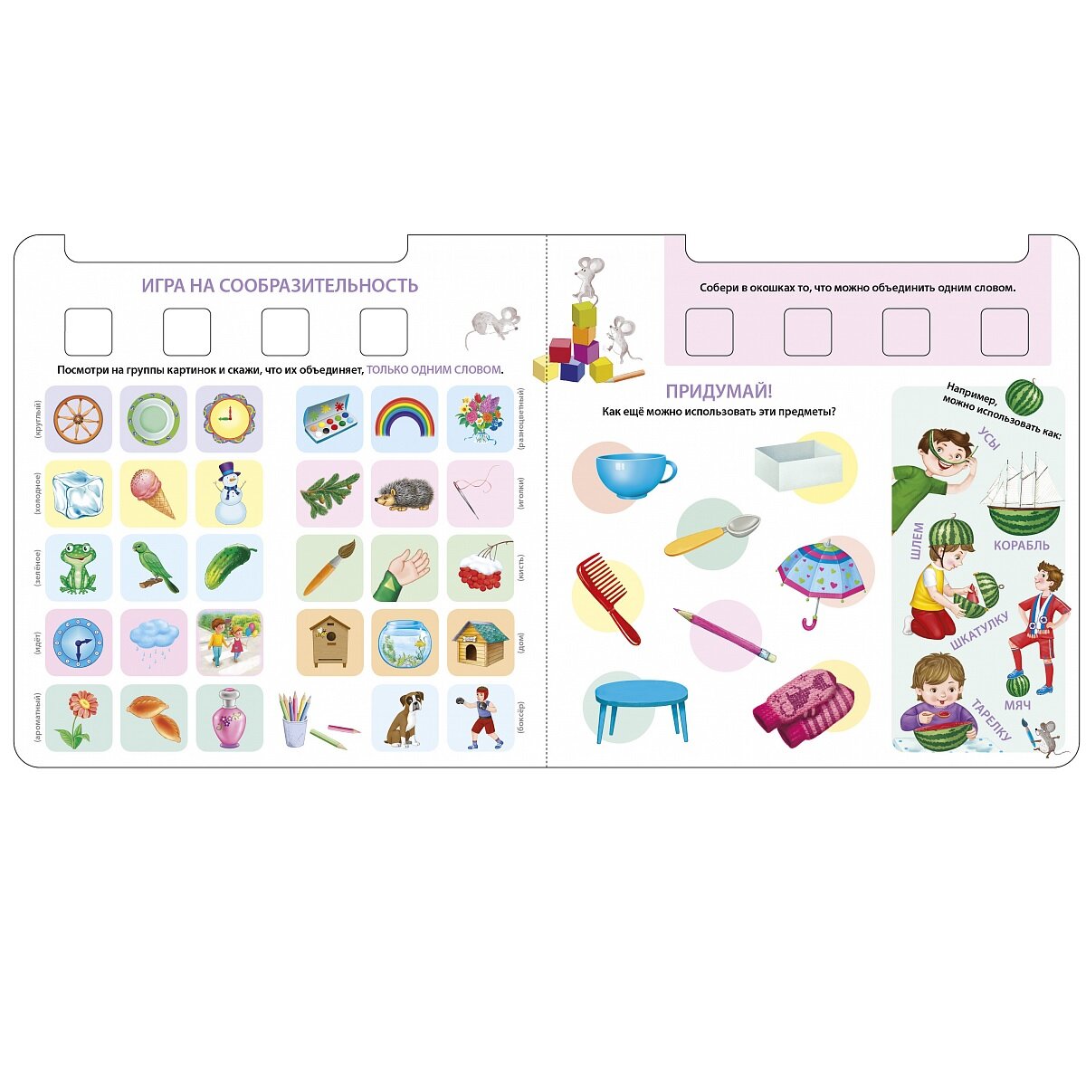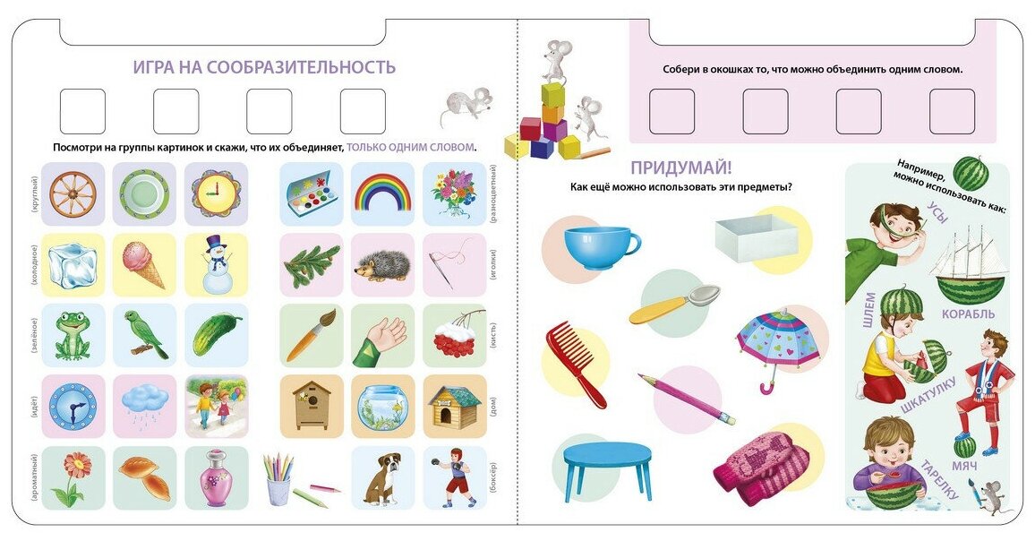 Обучающий игровой тренажёр «Развиваем креативное мышление» содержит целый комплекс игр для развития креативного мышления у детей 3-7 лет. С помощью пособия ребенок научится придумывать загадки и метафоры, составлять тематические и ассоциативные цепочки, а также в игровой форме потренирует зрительную и словесно-логическую память, разовьет аналитические способности отработает навыки аргументации.