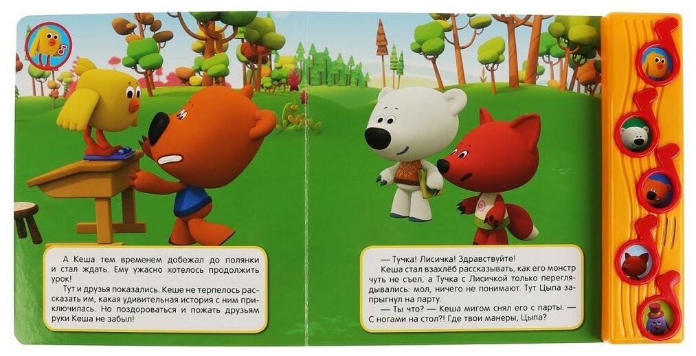 - 5 кнопок-ноток с песенками: "100, 4, 42, 33, 15", "На севере ели такие большие", "Вместе по лесу идут", "Птички", "Ла ла ла"