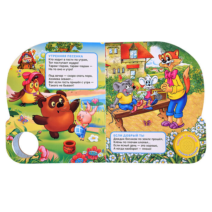 Ребёнок легко освоит включение звука: по нажатию на кнопку начинает проигрываться песенка, при втором нажатии звук выключится. Малыш с удовольствием будет рассматривать красочные, яркие странички с героями, слушать песни, подпевать и даже танцевать. Книжка сделана из плотного картона, поэтому мамы могут не опасаться, что ребёнок порвёт странички или поранит пальчики.