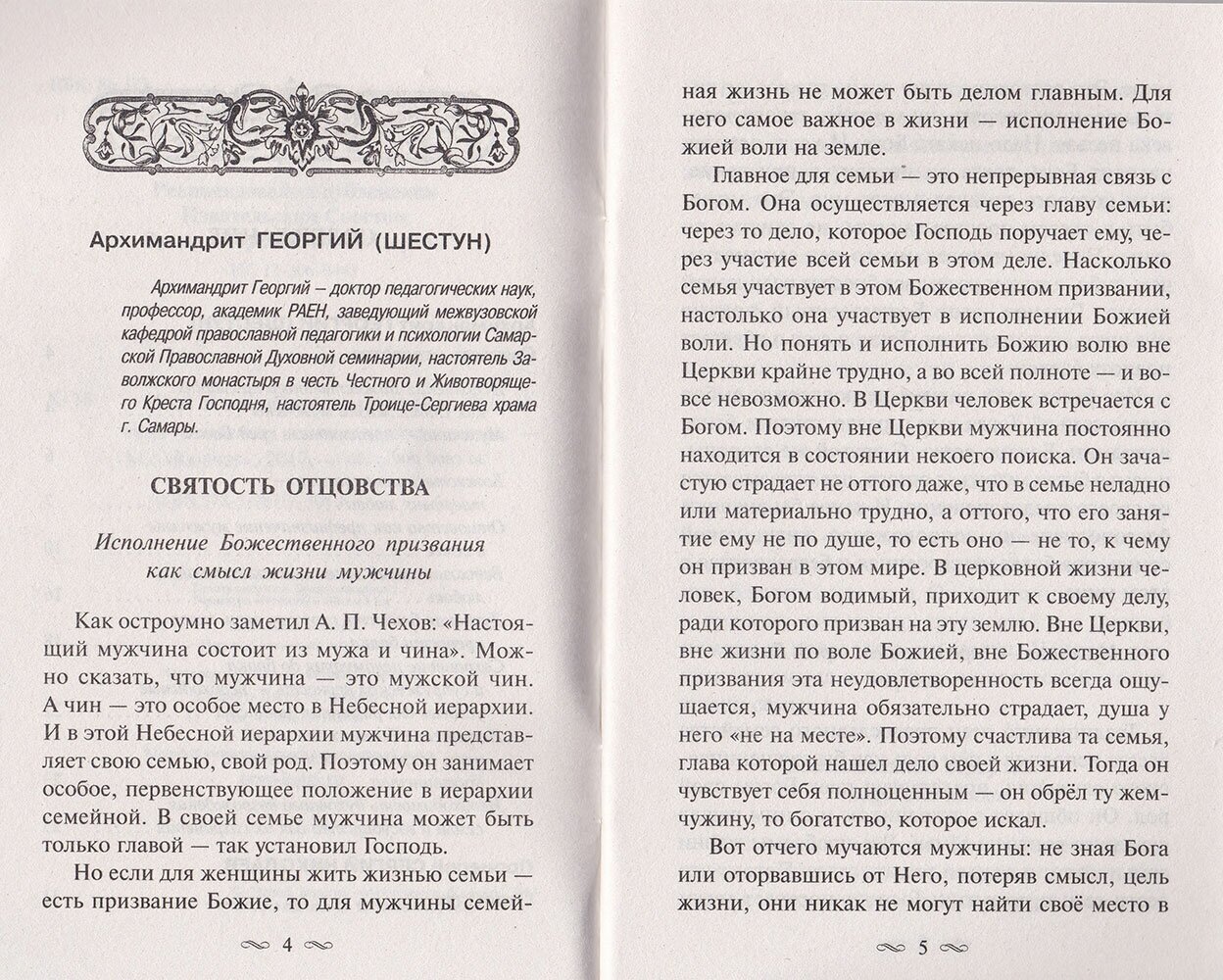 Как остроумно заметил А. П. Чехов: «Настоящий мужчина состоит из мужа и чина». Можно сказать, что мужчина — это мужской чин. А чин — это особое место в Небесной иерархии. И в этой небесной иерархии мужчина представляет свою семью, свой род. Поэтому он занимает особое, первенствующее положение в иерархии семейной. В своей семье мужчина может быть только главой — так установил Господь. Но если для женщины жить жизнью семьи — есть призвание Божие, то для мужчины семейная жизнь не может быть делом главным, для него самое важное в жизни — исполнение Божьей воли на земле. Об этом и многом другом повествует данная книжка.
