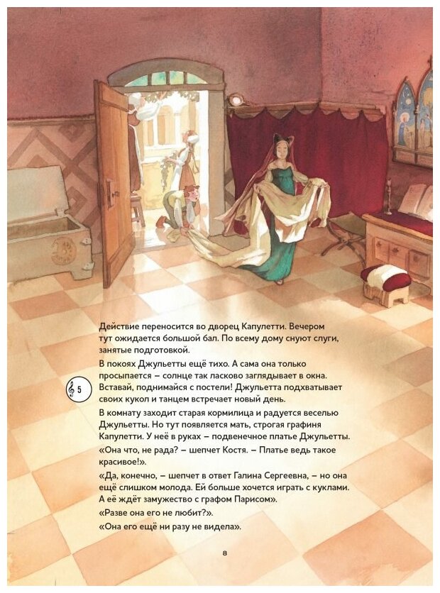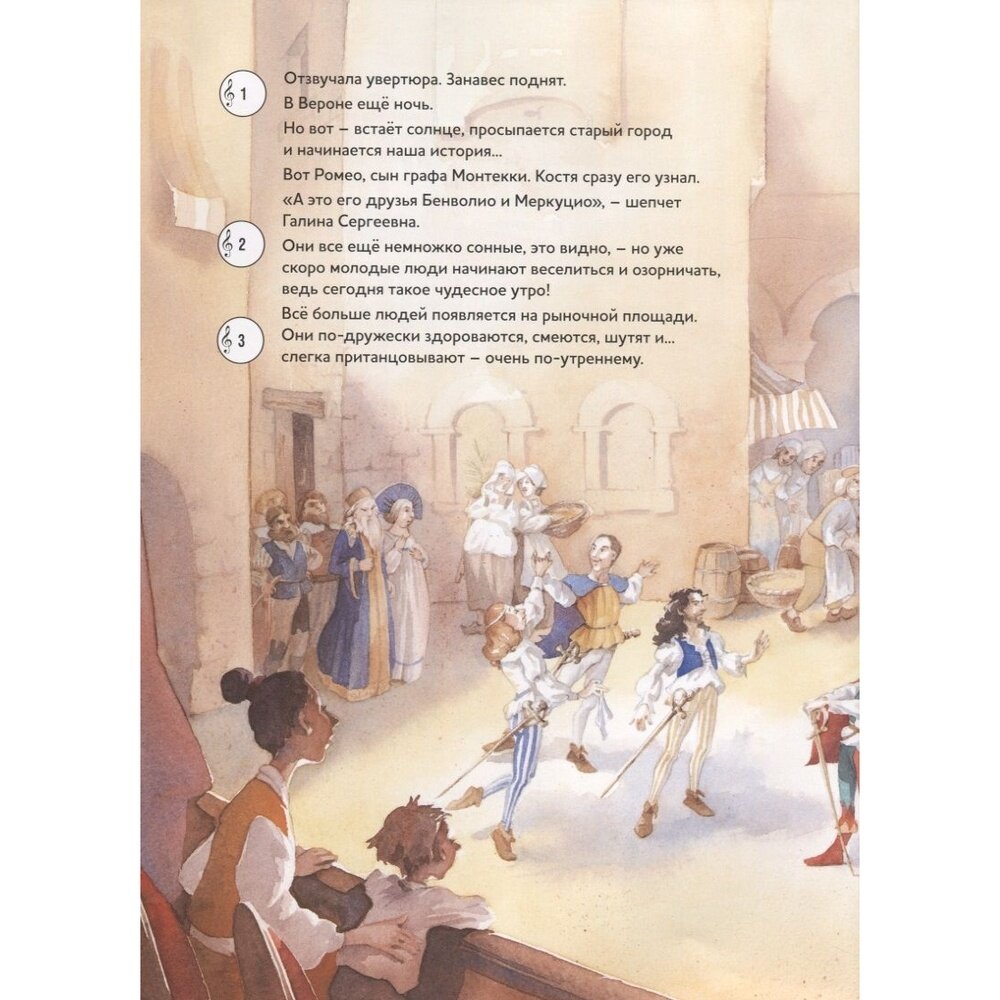 Трагическая история Ромео и Джульетты, написанная Уильямом Шекспиром в 1594–1595 годах, представлена в этой книге глазами юного ученика балетного класса Константина, которому выпадает удача принять участие в постановке балета на музыку Сергея Прокофьева. Двойная сюжетная линия книги и нежные акварельные иллюстрации художницы Анетте Блей позволят самым юным читателям познакомиться с сюжетом известнейшей трагедии без излишнего драматизма.