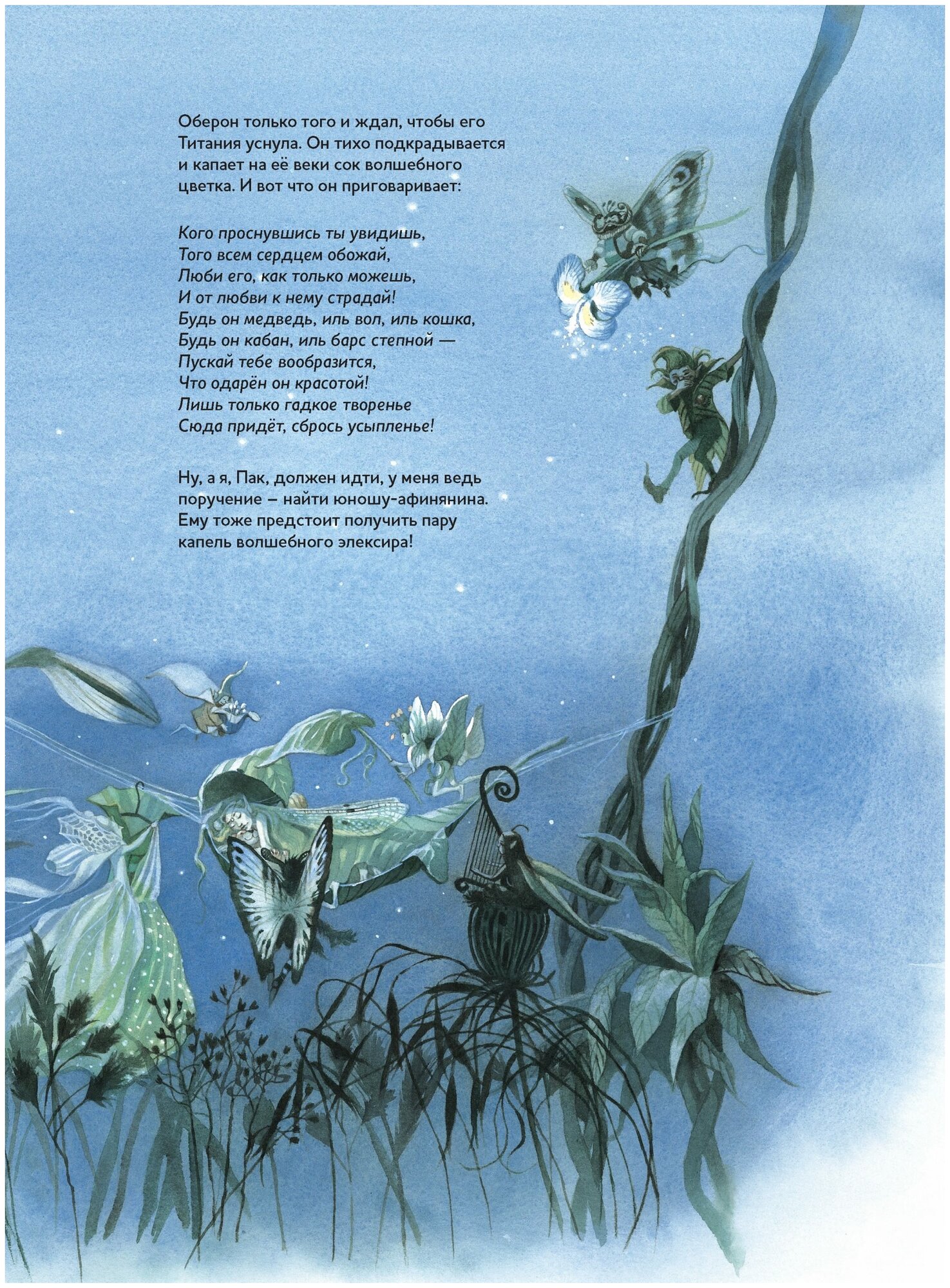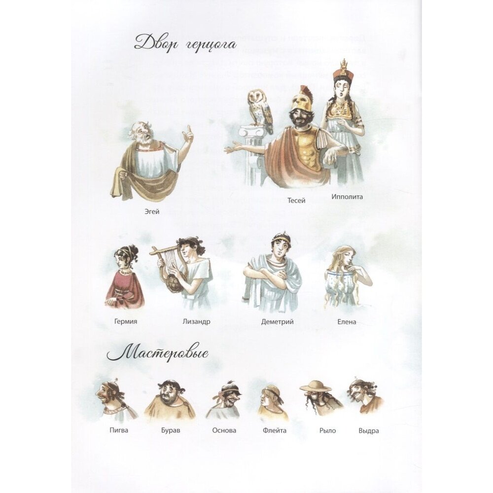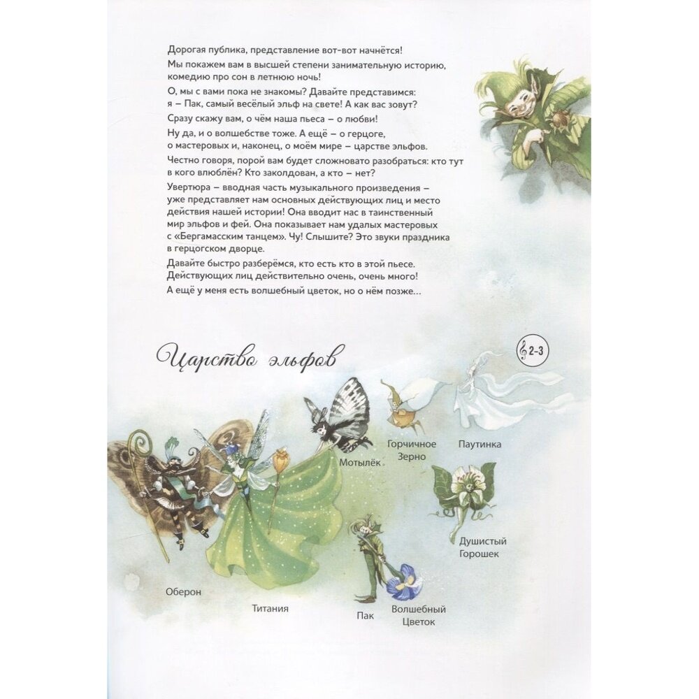 .В этой книге юных читателей ждёт весёлая и увлекательная история о ночных приключениях знатных молодых людей, а также эльфов и простаков-мастеровых. Все они – герои сказочной комедии Уильяма Шекспира, написанной в 1594–1596 годах. Концертная увертюра Феликса Мендельсона, созданная для постановки этой комедии при дворе короля Фридриха-Вильгельма IV, перенесёт детей и их родителей в леса под Афинами, где проказливые эльфы с помощью волшебных чар запутывают влюблённых молодых людей и дурачат недотёп-ремесленников, отправившихся в лес репетировать.