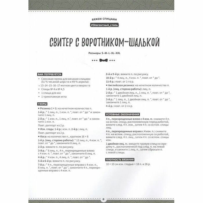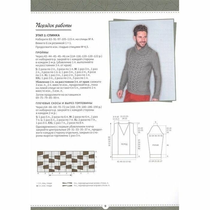 В книге представлены действительно стильные базовые носибельные модели мужских кардиганов, свитеров, жилетов. Привлекает разнообразие деталей, а именно воротник - шалька, гольф или стойка; застежка-поло или молния. Интересен пуловер с рукавами реглан и жаккардовым узором; свитер в матросском стиле с капюшоном. Пуловеры можно сочетать с аксессуарами, описания которых также можно найти в книге. Это шапки, шарфы, снуды и даже домашние туфли.
