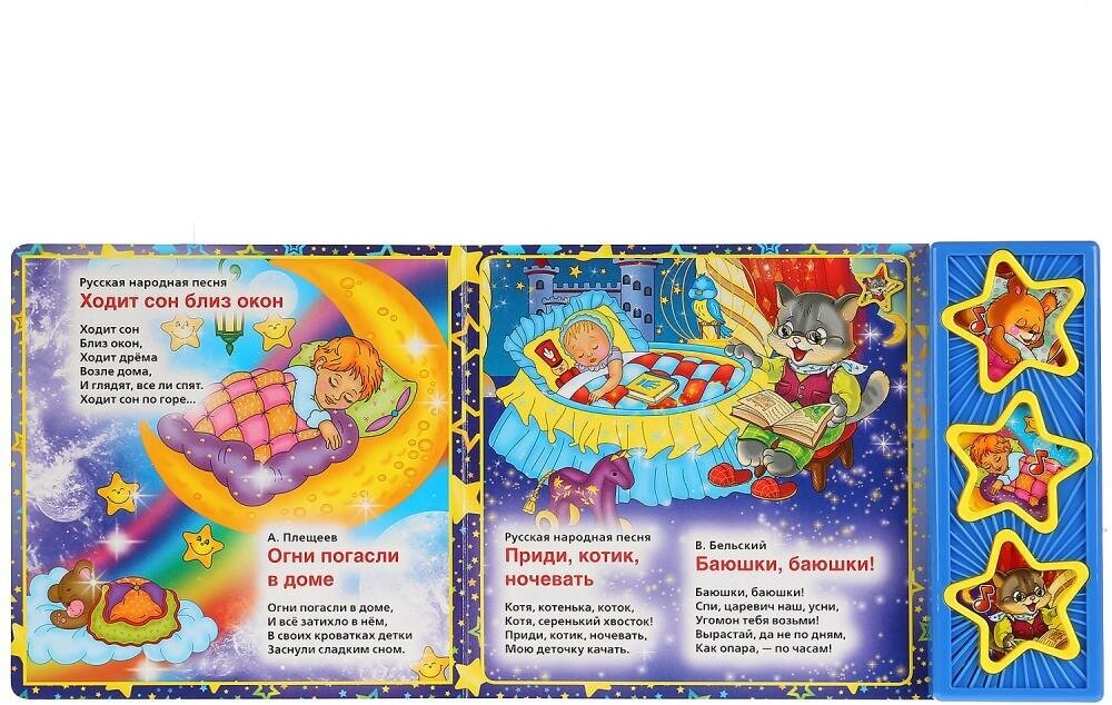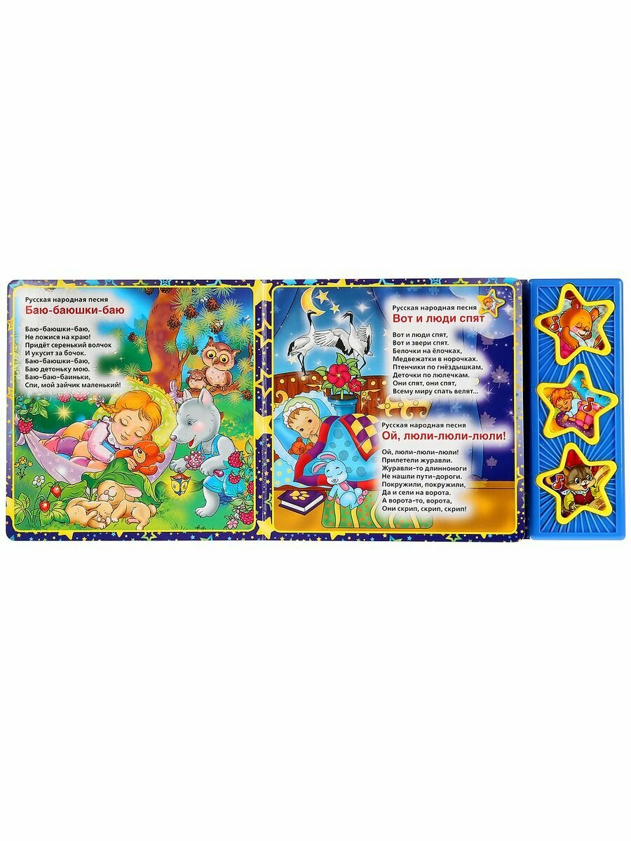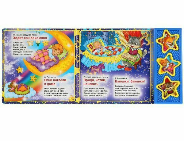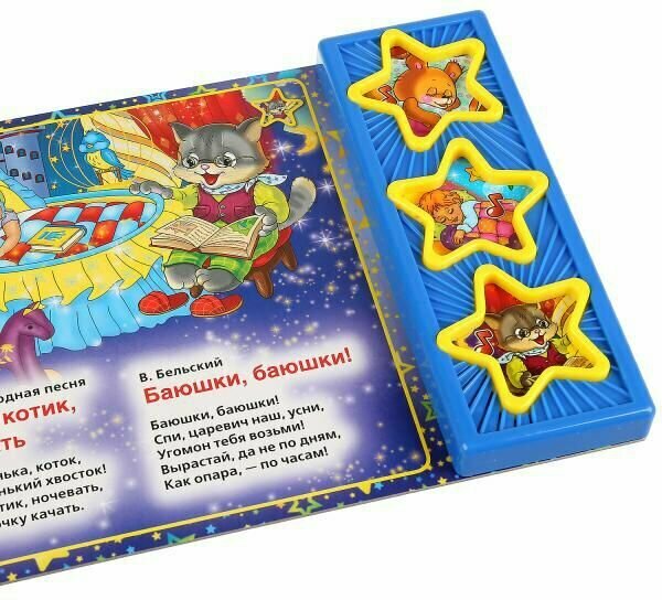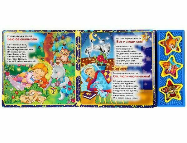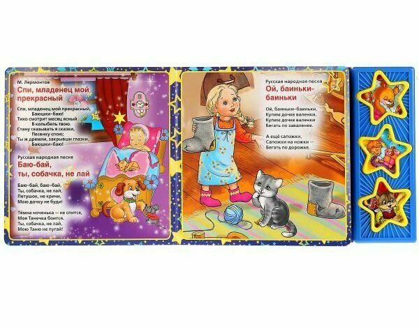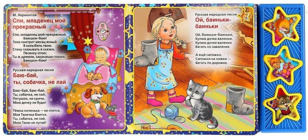 Компактная книга из прочного безопасного картона с кнопкой для прослушивания. Любимые авторы, народные фольклор, истории по мультфильмам, и конечно песенки!