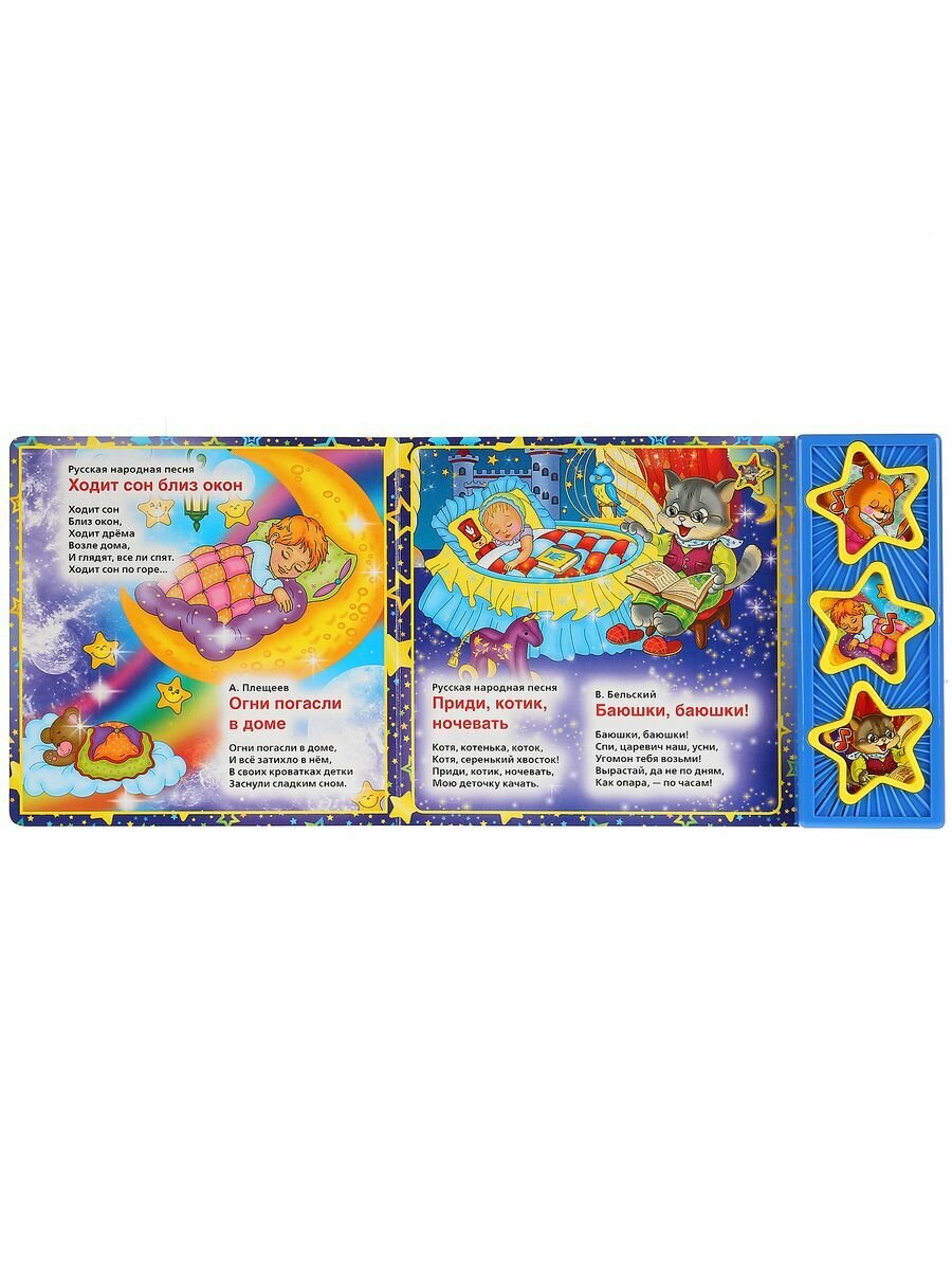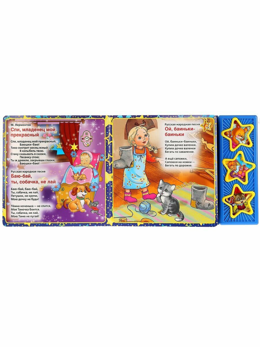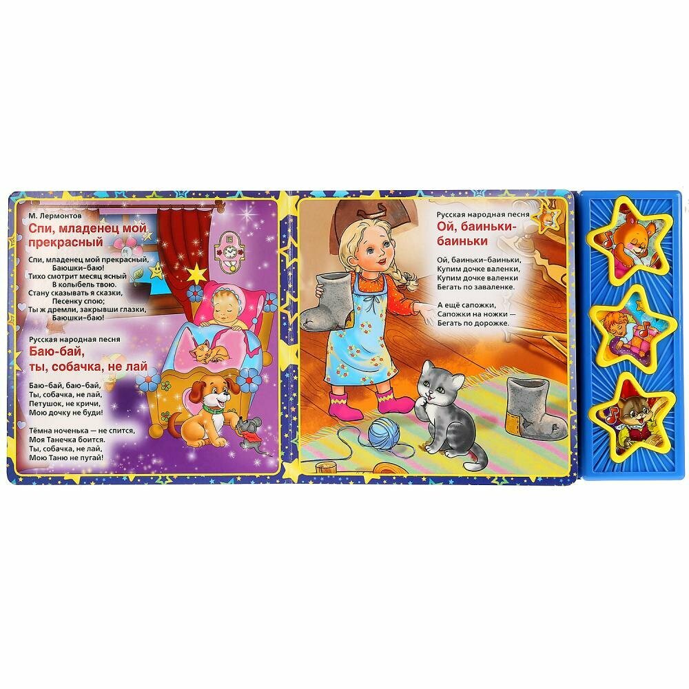 Компактная книга из прочного безопасного картона с кнопкой для прослушивания. Любимые авторы, народные фольклор, истории по мультфильмам, и конечно песенки!