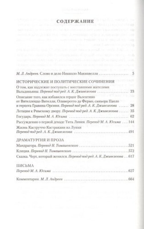 В книге представлены разные стороны интеллектуального и творческого наследия флорентийского государственного деятеля и мыслителя эпохи Возрождения Никколо Макиавелли, в том числе знаменитый политический трактат «Государь», который стал самым известным его сочинением, снискал автору недобрую славу имморалиста и породил термин «маккиавелизм», означающий цинизм, вседозволенность и двуличие в политике, а также дополняющая и проясняющая многие моменты этого труда работа «Рассуждения о первой декаде Тита Ливия». В том также включены другие политические сочинения Макиавелли, образцы его драматургии и художественной прозы и избранные письма. Издание снабжено вступительной статьей и подробными комментариями.