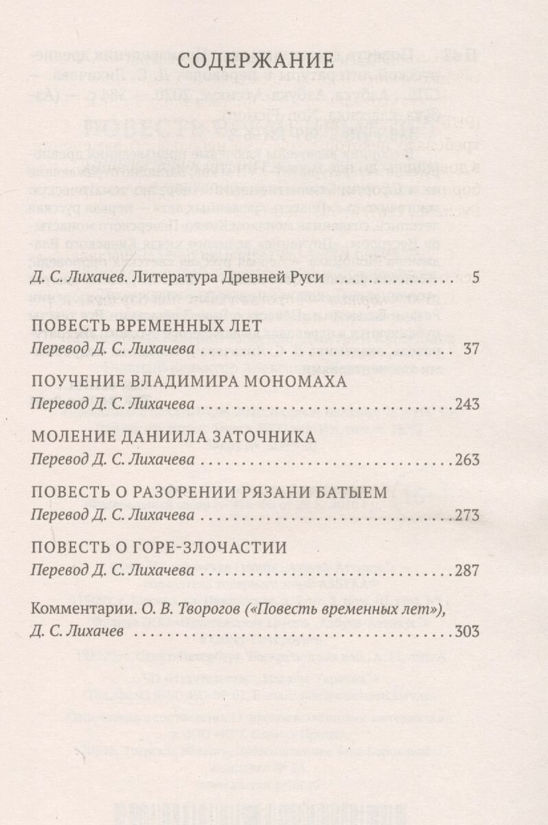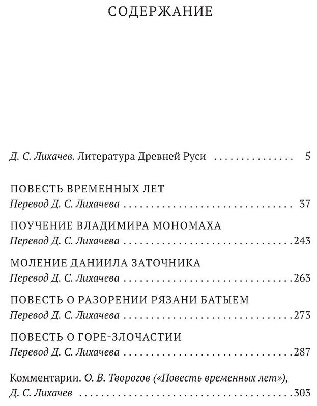 В сборник включены ключевые произведения древнерусской литературы XII–XVII веков, наглядно отражающие ее жанровую, стилистическую и образно-тематическую многоликость: «Повесть временных лет» — первая русская летопись, созданная монахом Киево-Печерского монастыря Нестором; «Поучение» великого князя Киевского Владимира Мономаха — первая русская светская проповедь; «Моление Даниила Заточника» – один из ранних опытов русской дворянской публицистики; «Повесть о разорении Рязани Батыем» и «Повесть о Горе-Злочастии». Все тексты публикуются в переводах выдающегося русского литературоведа, академика Д. С. Лихачева и снабжены подробными комментариями.