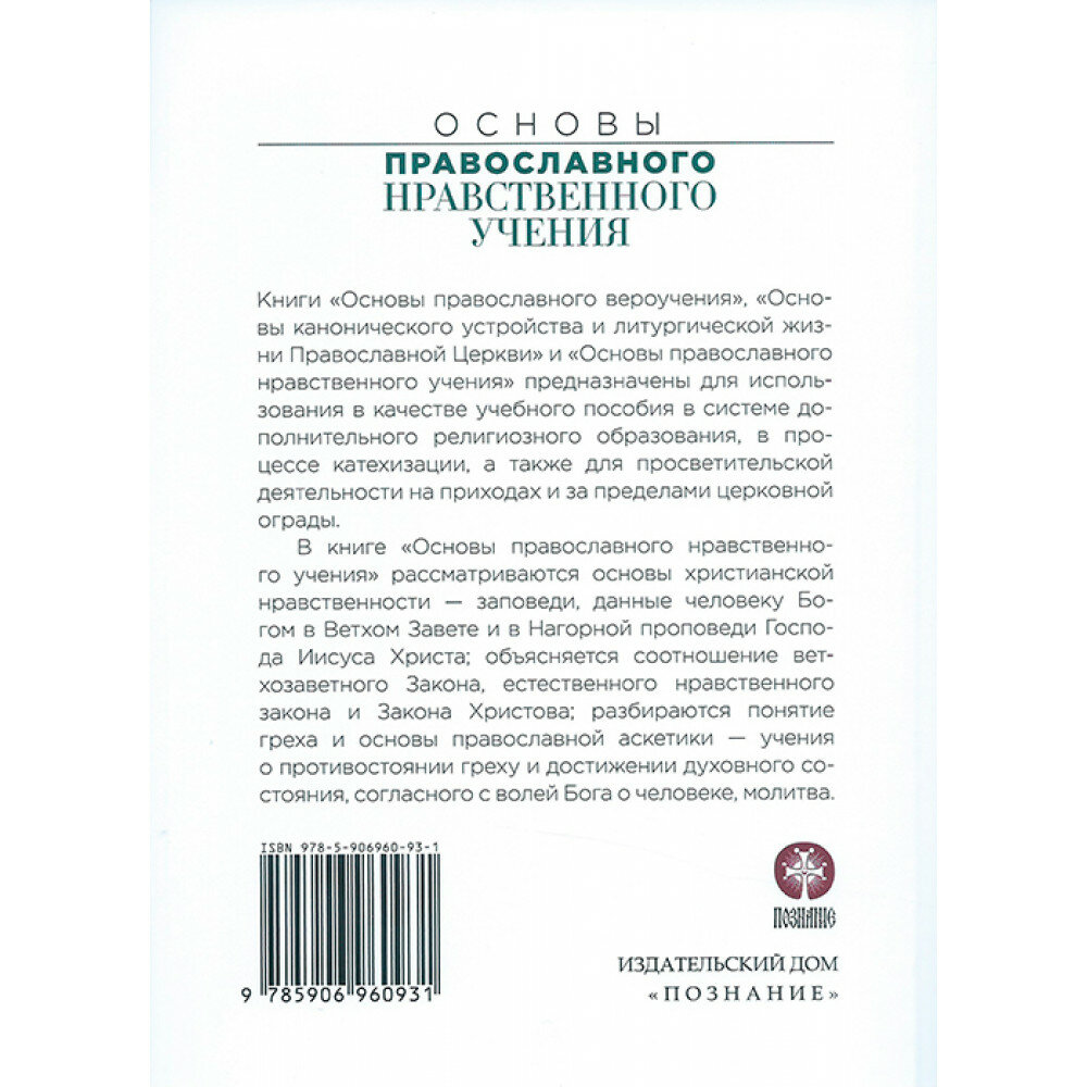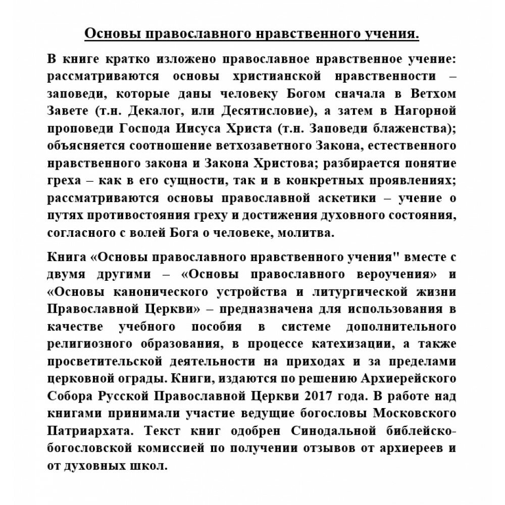 Книга "Основы православного нравственного учения" вместе с двумя другими - "Основы православного вероучения" и "Основы канонического устройства и литургической жизни Православной Церкви" - предназначена для использования в качестве учебного пособия в системе дополнительного религиозного образования, в процессе катехизации, а также просветительской деятельности на приходах и за пределами церковной ограды. Книги, издаются по решению Архиерейского Собора Русской Православной Церкви 2017 года. В работе над книгами принимали участие ведущие богословы Московского Патриархата. Текст книг одобрен Синодальной библейско-богословской комиссией по получении отзывов от архиереев и от духовных школ.