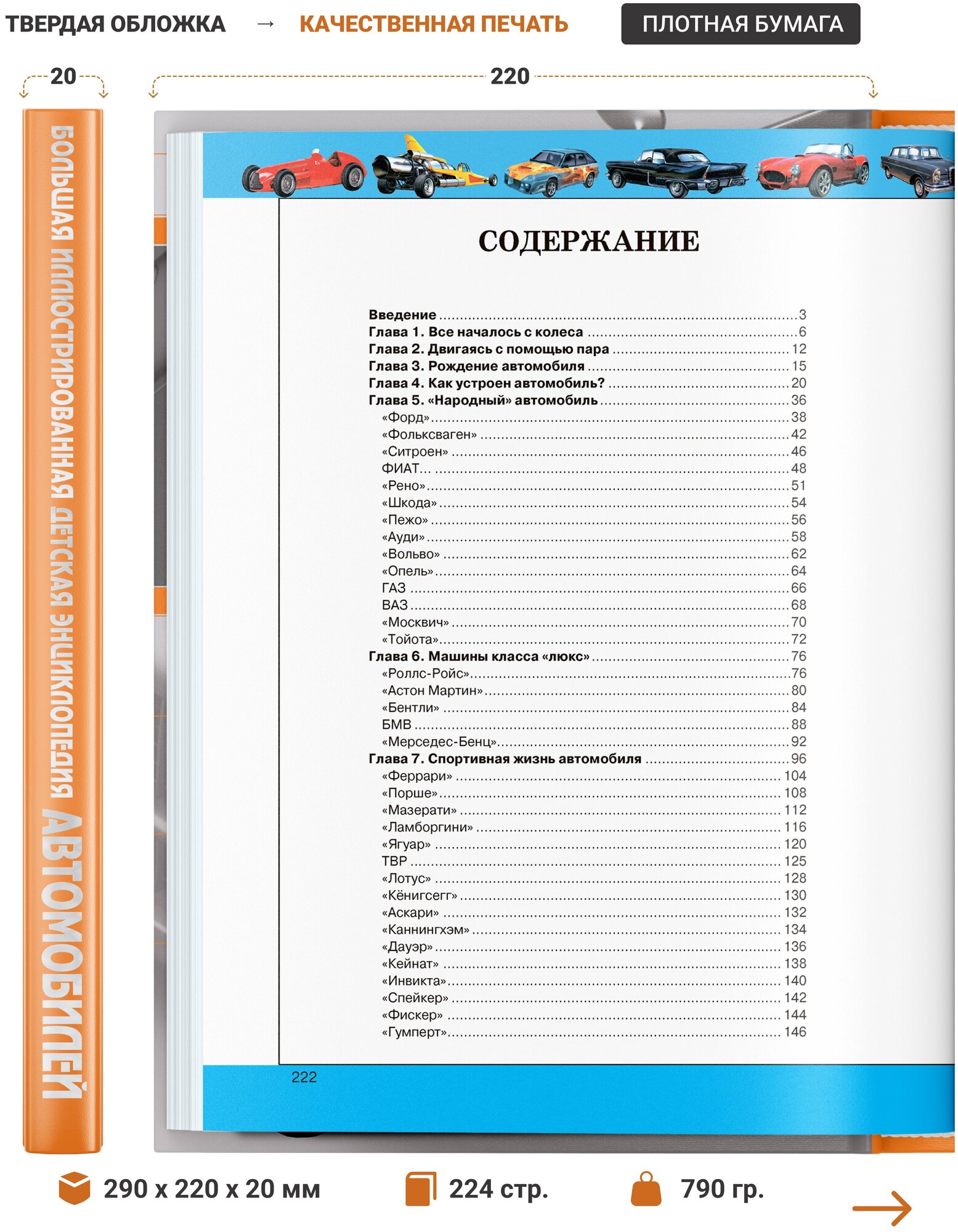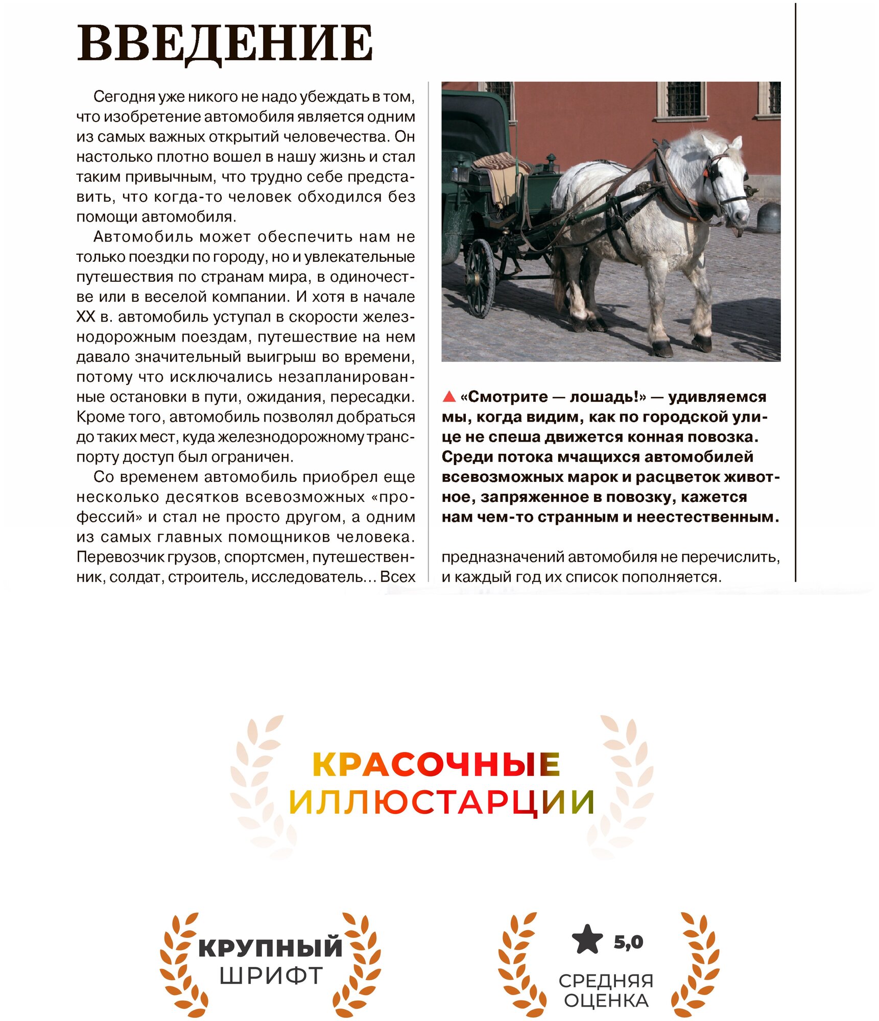 Купила книгу в подарок, ребёнку 7 лет очень понравилась! Он фанатеет автомобилями. Книга большая, переплёт толстый, шрифт не мелкий, изложение материала доступно для самостоятельного прочтения ребёнком, иллюстраций много и все красочные! В книге несколько статей посвящено истории создания автомобиля. Остальные главы - это информация об автомобилях разных марок! Изложено кратко, но емко и интересно! В общем, рекомендую к покупке!