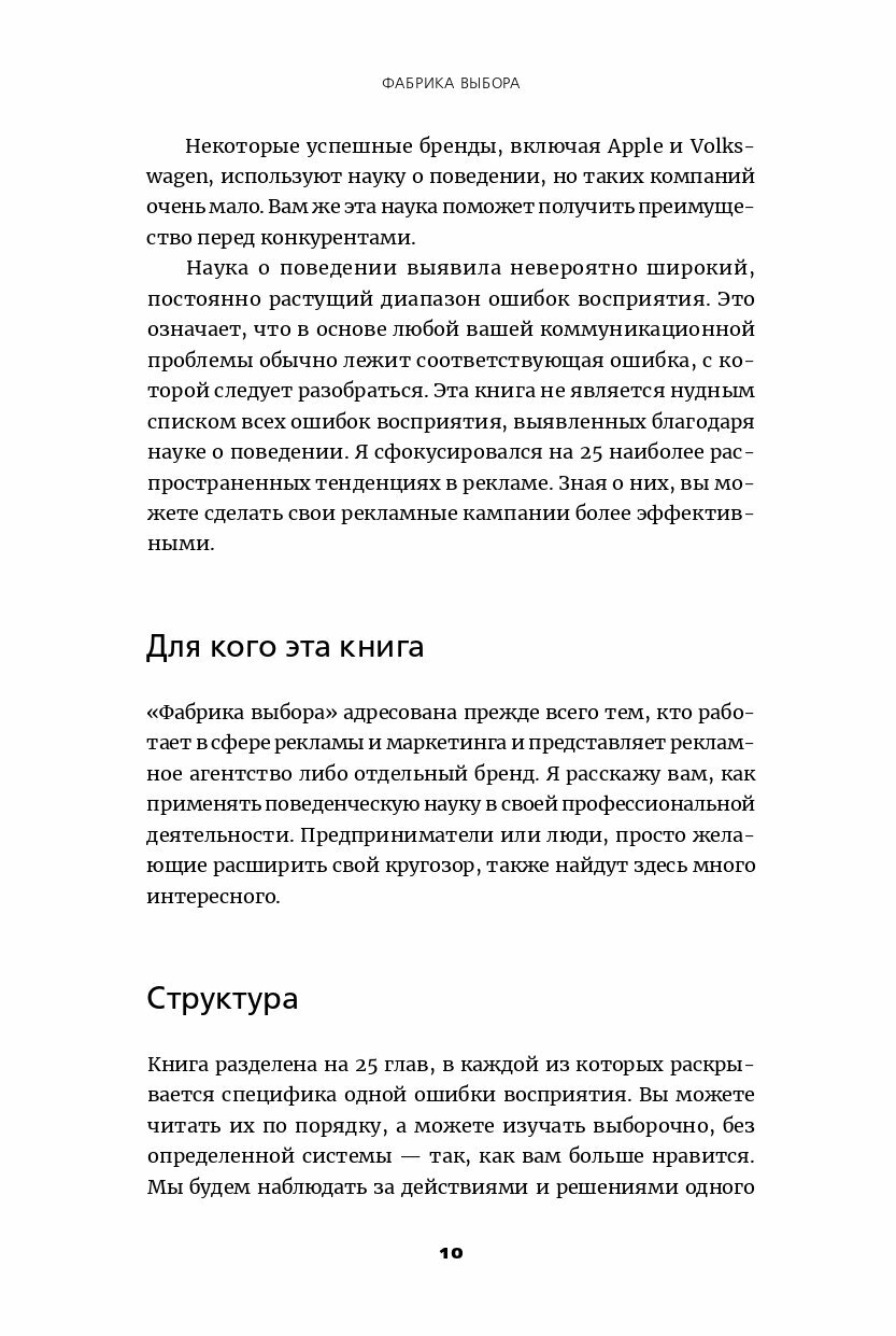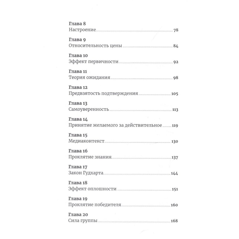 Ричард Шоттон разбирает 25 самых распространенных предубеждений, опираясь на реальные кейсы, мнения экспертов и результаты исследований и экспериментов (проведенных ведущими мировыми учеными, такими как нобелевские лауреаты Даниэль Канеман и Герберт Саймон или психологи Эллиот Аронсон и Леон Фестингер), в том числе собственных, и дает маркетологам рабочие инструменты для обращения на пользу компании каждого из этих предубеждений. Зная о том, что именно удерживает ваших клиентов от совершения покупки, вы сможете использовать эти знания на пользу вашим маркетинговым кампаниям и существенно увеличите продажи.