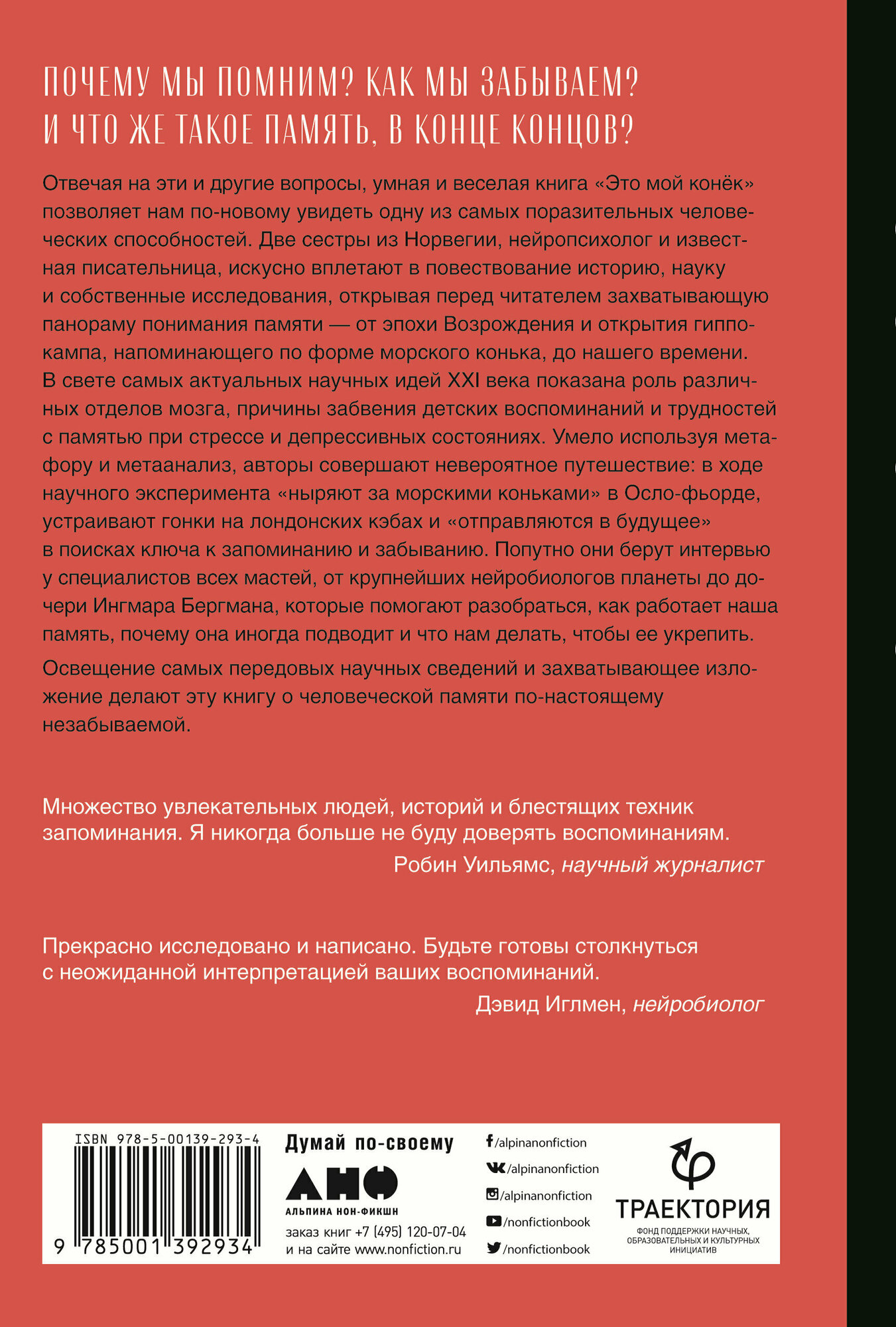 Отвечая на эти и другие вопросы, умная и веселая книга «Это мой конёк» позволяет нам по-новому увидеть одну из самых поразительных человеческих способностей. Две сестры из Норвегии, нейропсихолог и известная писательница, искусно вплетают в повествование историю, науку и собственные исследования, открывая перед читателем захватывающую панораму понимания памяти — от эпохи Возрождения и открытия гиппокампа, напоминающего по форме морского конька, до нашего времени.