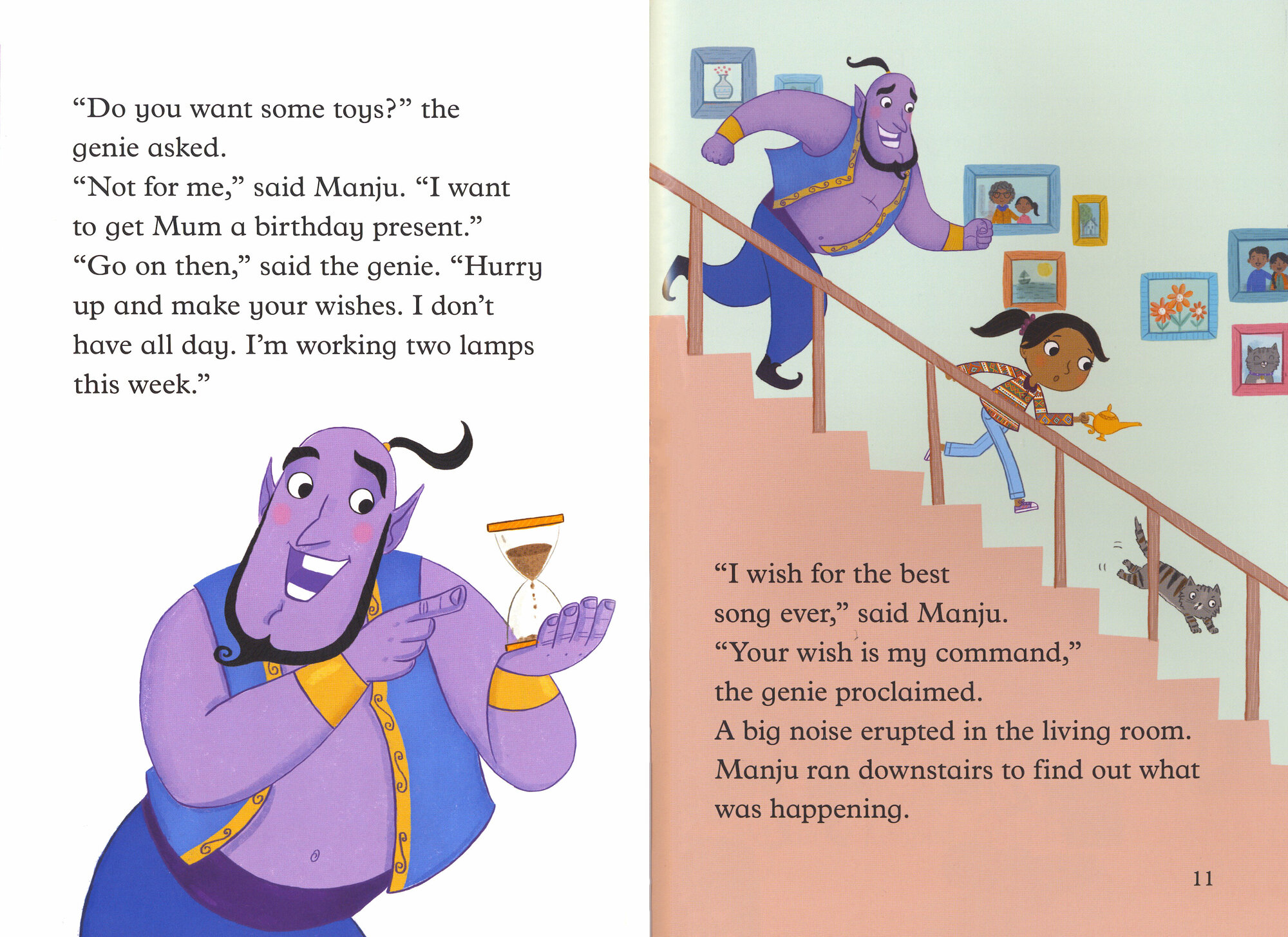 Manju wants to get a present for her Mum's birthday but Cumin her cat isn't sure about the toy elephant or robot. So when they find Grandma's magic lamp, Manju is granted seven wishes to find the best present. But each wish starts to go wrong and soon the house is filled with a rock band, aliens and pirates! Can Manju and Cumin wish for the perfect gift?
