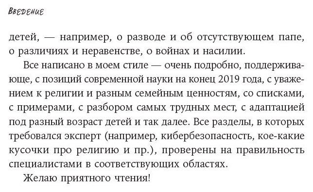 Каждой теме в книге посвящена отдельная глава. В итоге получился взросло-детский разговорник, призванный помочь начать беседу и донести важные мысли и ценности, учитывая возраст и особенности восприятия ребенка.