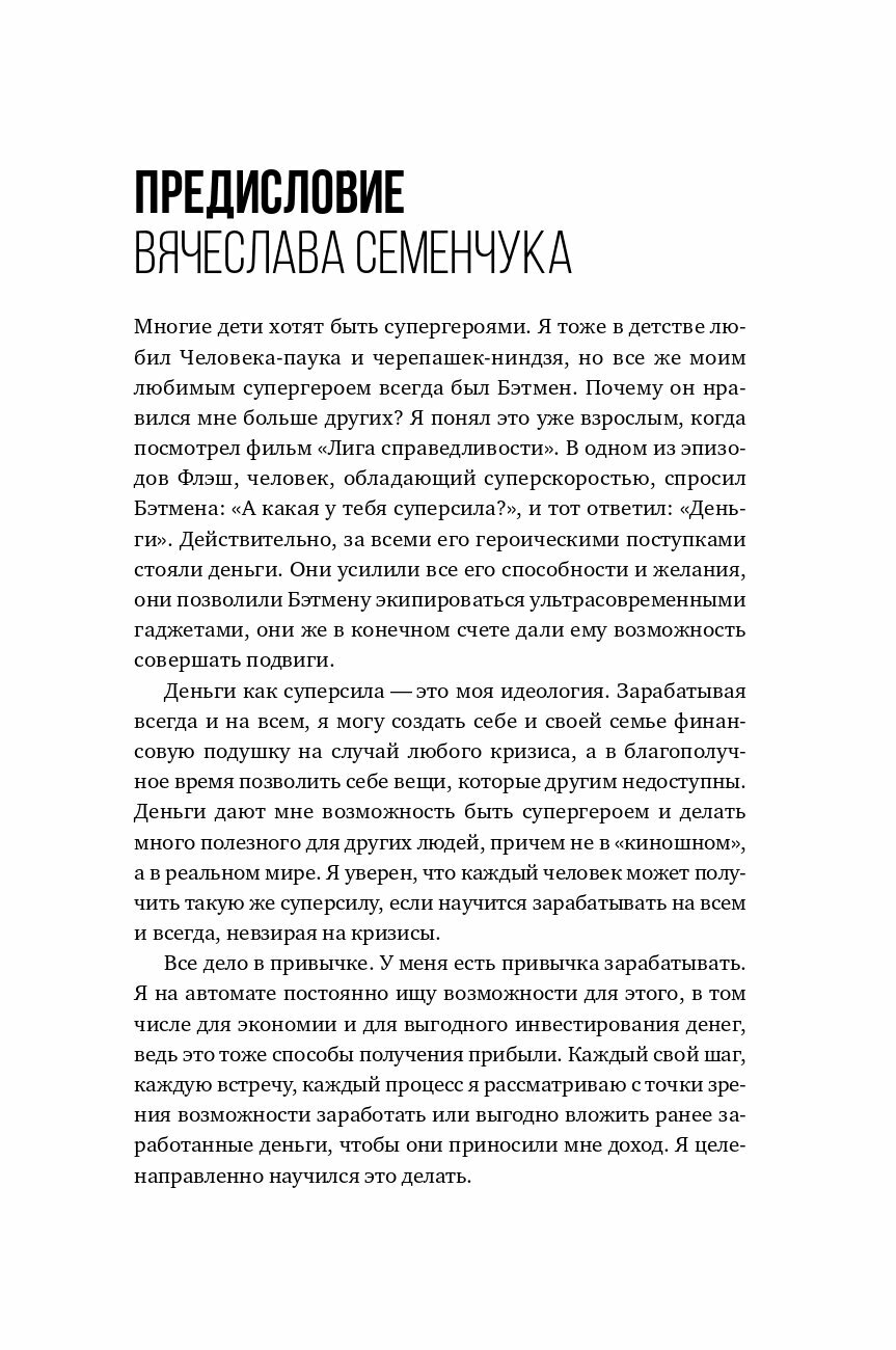 Авторы этой книги, Вячеслав Семенчук и Глеб Марков, уверены, что каждый человек может научиться зарабатывать на всем и всегда, невзирая на трудности или кризисы. Все дело в привычке рассматривать любое событие как возможность заработать, сэкономить или выгодно инвестировать уже имеющиеся деньги — то есть не упускать ни одной возможности получения прибыли. Без приложения суперусилий.