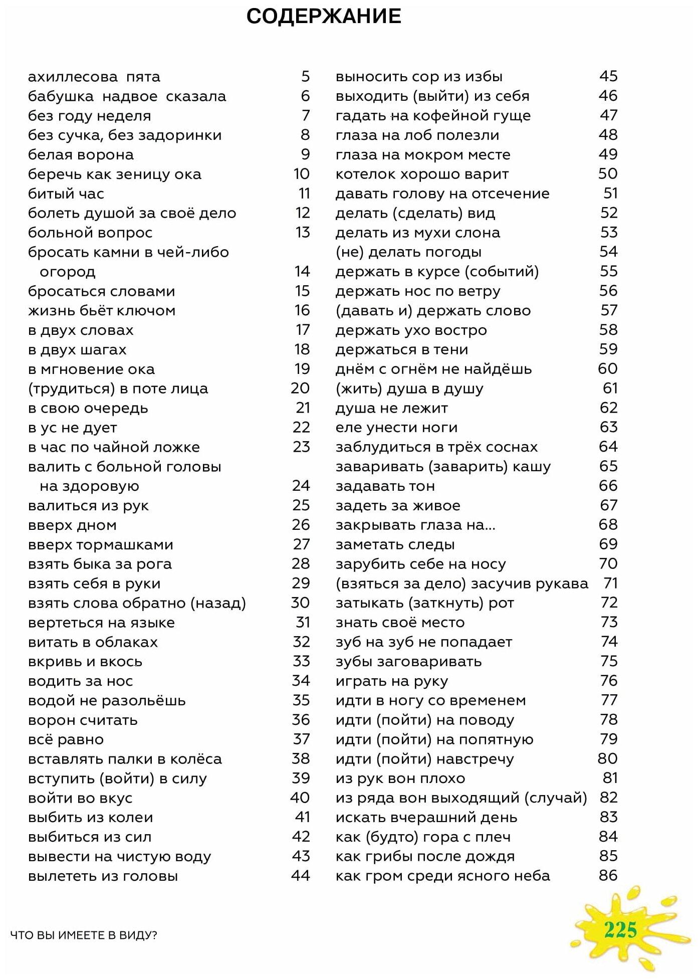 Данное пособие по русскому языку как иностранному представляет собой компактный словарь русских устойчивых словосочетаний в картинках. Автор текста и иллюстраций — Г.Г. Малышев, большой специалист в использовании иллюстрированного материала в преподавании РКИ. Словарь включает 220 устойчивых словосочетаний русского языка (и это необязательно пословицы и поговорки). Каждое из словосочетаний иллюстрируют две картинки: первая семантизирует словосочетание, а вторая показывает одну из возможных речевых ситуаций, в которых оно используется. Между двумя этими визуальными образами мы видим микродиалоги, показывающие примеры употребления в речи.