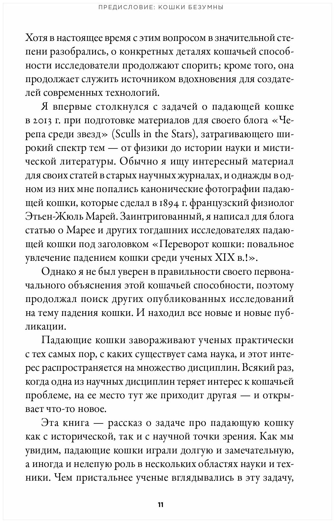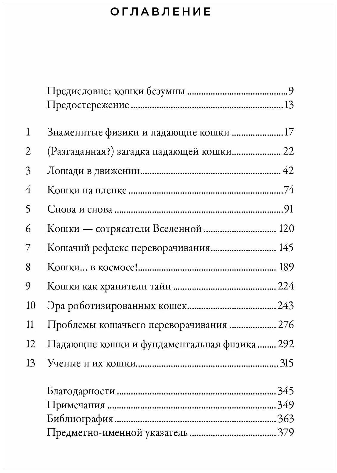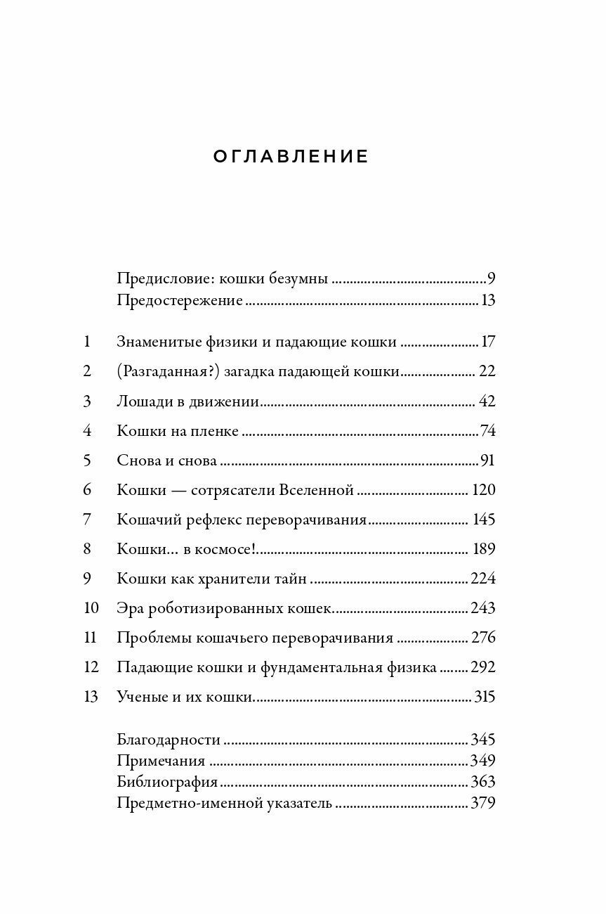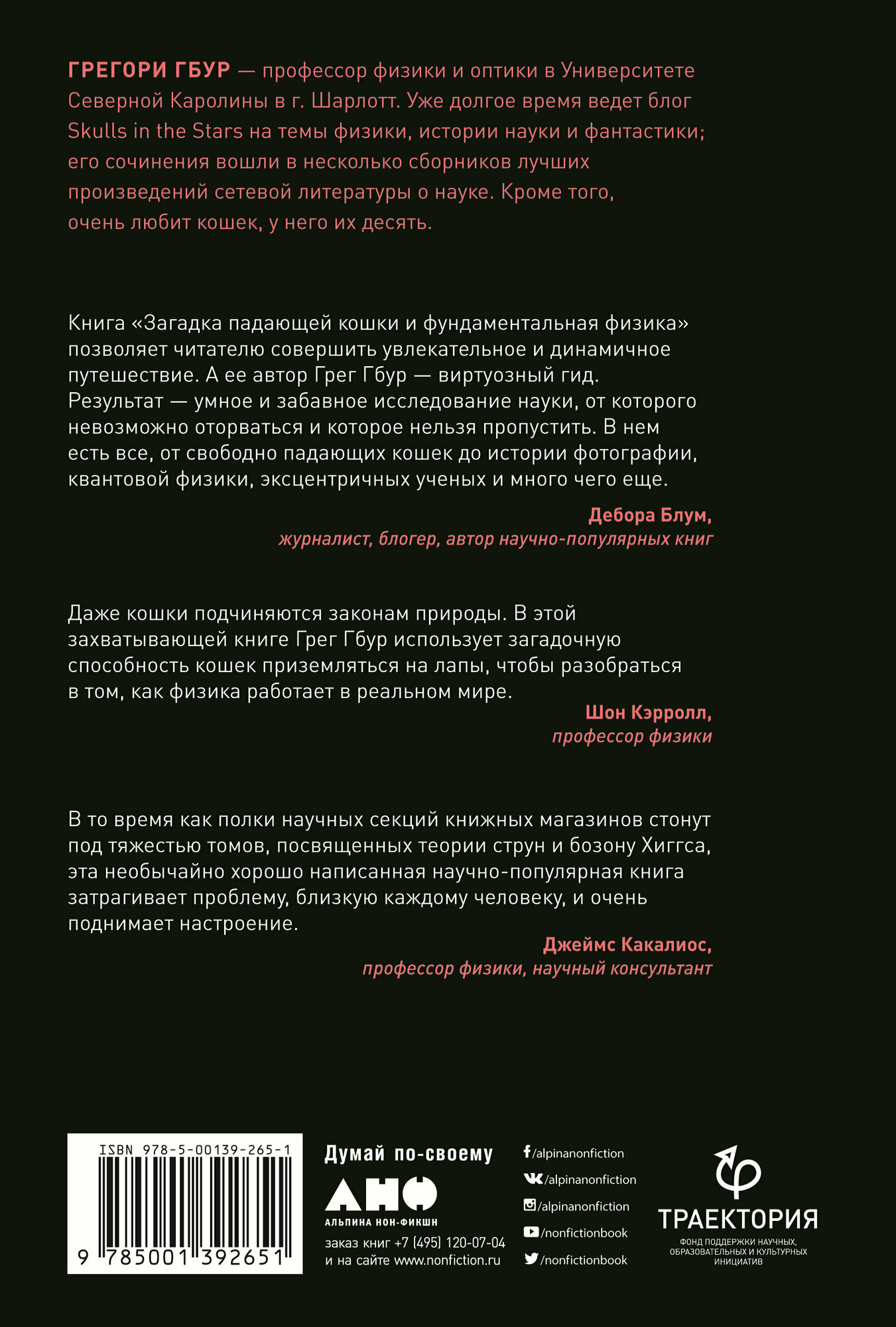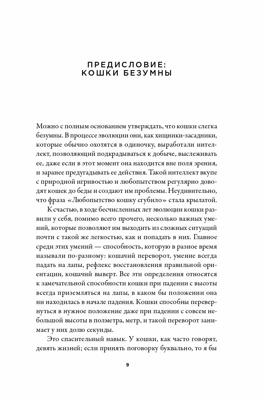 Как падающим кошкам всегда удается приземлиться на четыре лапы? Удивительно, сколько времени потребовалось ученым, чтобы ответить на этот вопрос! История изучения этой кошачьей способности почти ровесница самой физики — первая исследовательская работа на тему падающей кошки была опубликована в 1700 г. французом Антуаном Параном, но даже сегодня ученые продолжают находить в ней спорные моменты. В своей увлекательной и остроумной книге физик и заядлый кошатник Грегори Гбур показывает, как попытки понять механику падения кошек помогли разобраться в самых разных задачах в математике, физике, физиологии, неврологии и космической биологии, способствовали развитию фотографии и кинематографа и оказали влияние даже на робототехнику. Поиск ответа на загадку падающей кошки погружает читателей в увлекательный мир науки, из которого они узнают решение головоломки, но также обнаружат, что феномен кошачьего выверта по-прежнему вызывает горячие споры ученых. Автор убежден, что чем больше мы исследуем поведение этих животных, тем больше сюрпризов они нам преподносят.