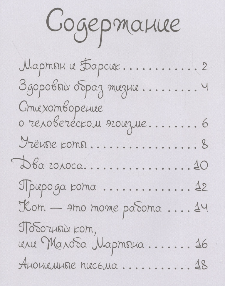Забавные стихи про двух котов - Мартына и Барсика - и их хозяйку. Коты скучают за хозяйкой, «помогают» ей по дому, задирают друг друга, пытаются избавиться от хозяйкиного жениха, рассуждают о месте кота в человеческой жизни. В общем, это очень занятые и непоседливые котики. Несложные и ритмичные стихи очень легко и быстро запоминаются. Большие красочные иллюстрации на каждой странице тоже очень хороши! В книге 15 добрых и смешных стихотворений. На первом развороте нарисована схема глажки кота, на последнем - схема устройства кота. Книга красивая, добрая, с юмором. Понравилась и детям, и взрослым.