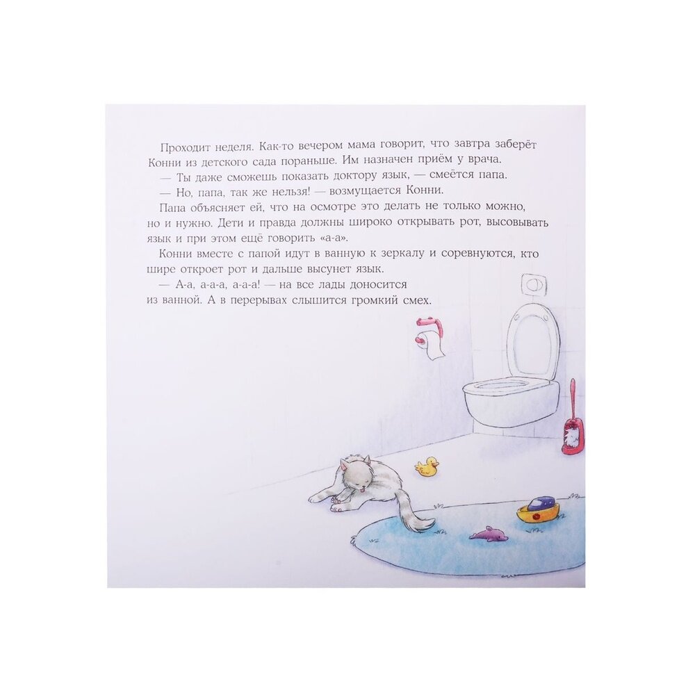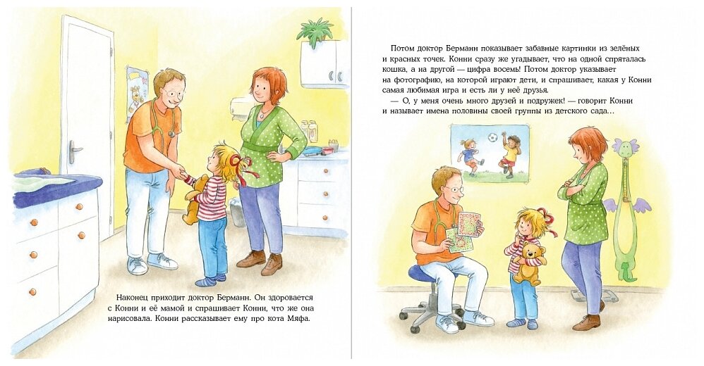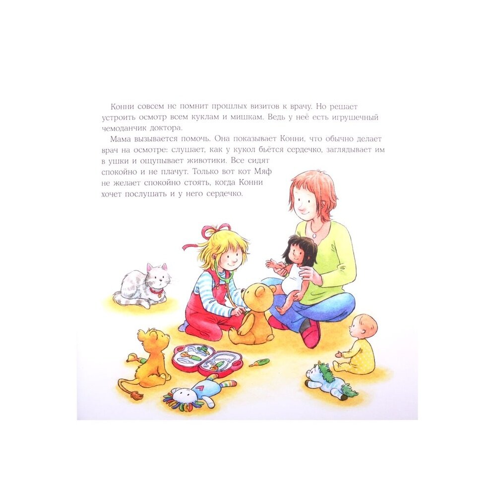Эта история, как и все про Конни, терапевтическая, прочитав ее и обсудив с ребенком, можно объяснить ему, что бояться врачей не стоит. Если у малыша существует такой страх, эта книга обязательно должна быть в вашей библиотеке. На примере смелой Конни малыш может понять, как важно посещать доктора, и что он не злой и совсем не страшный.