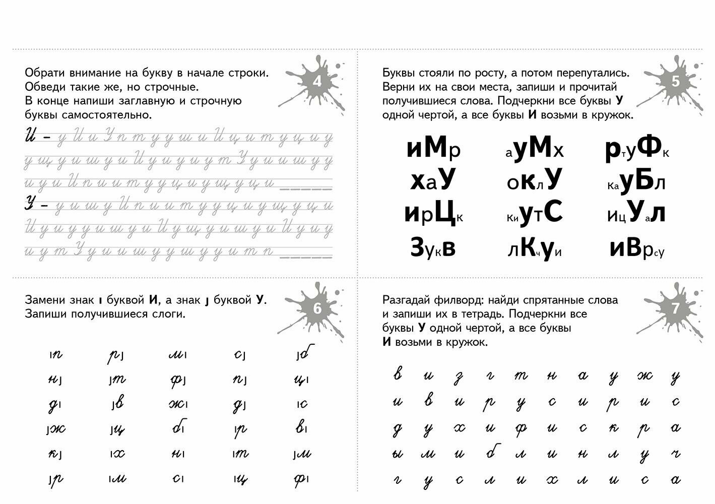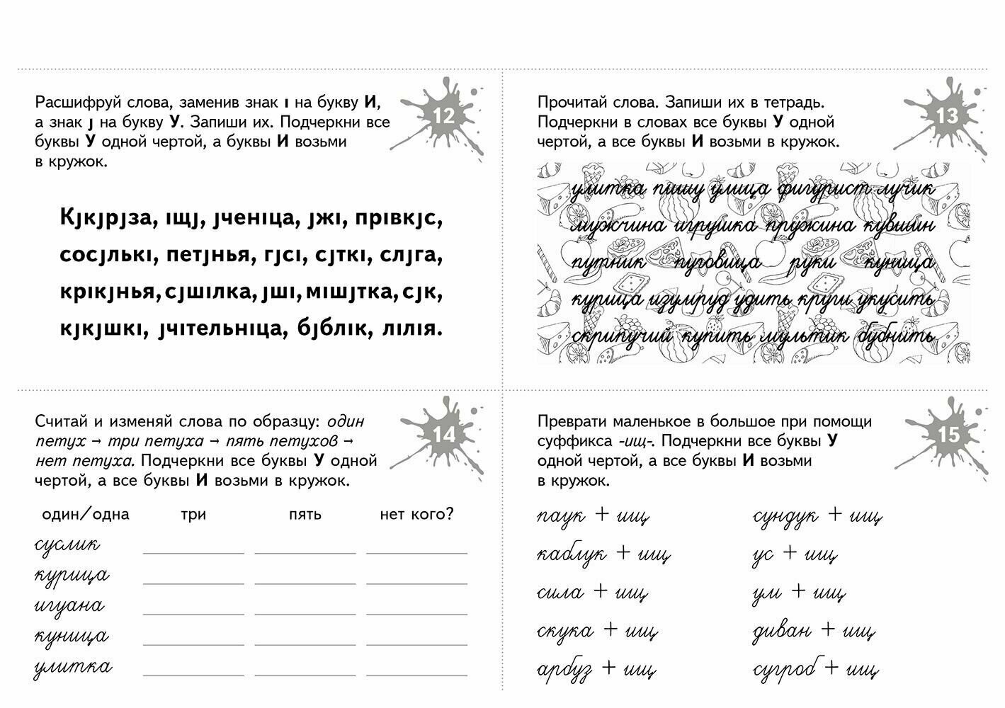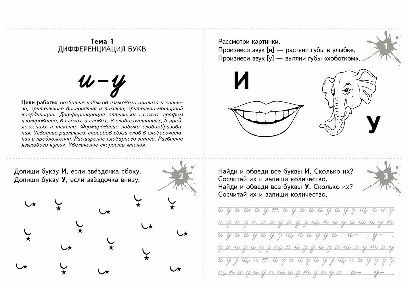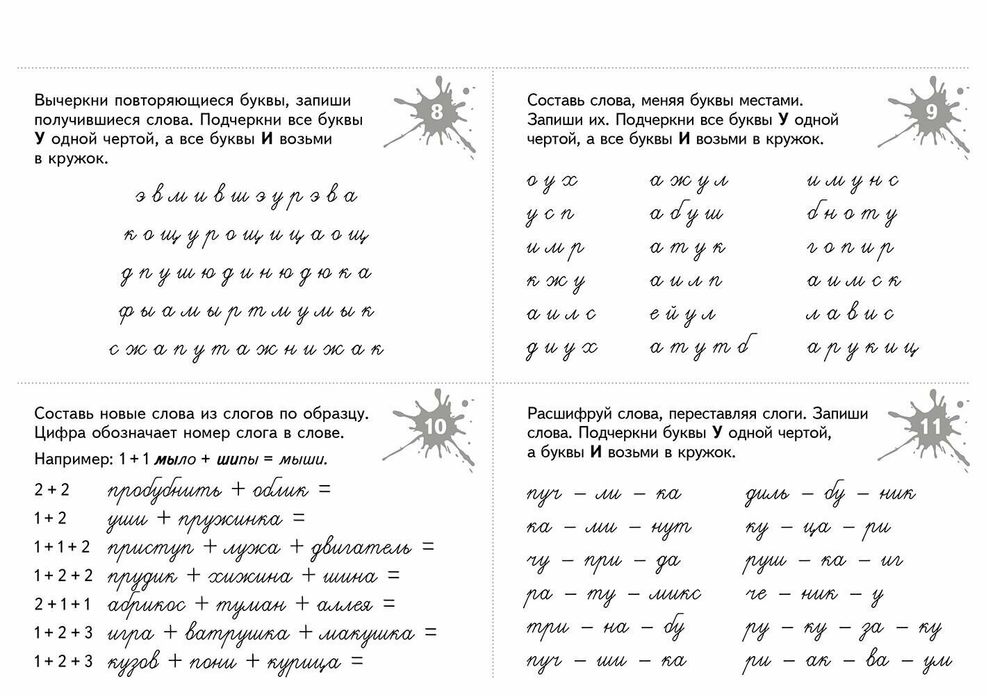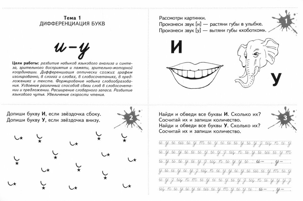 В пособии представлено 175 разнообразных игровых заданий, которые способствуют развитию не только оптико-пространственных представлений, но и всех компонентов речи в целом. Дифференцируемые пары букв (и-у, и-ш, б-д, в-д, п-т) отрабатываются последовательно: изолированно, в слогах, словах, словосочетаниях, предложениях и текстах. Книга состоит из пяти тем, в каждой из них - 35 рабочих карточек. Карточки содержат игровые задания, в том числе филворды, игры-перевертыши, анаграммы, и "зашумленные" тексты. Для облегчения запоминания материала использован метод ассоциаций и другие мнемотехники. Задания соответствуют возрастным психологическим особенностям детей от 7 до 10 лет.