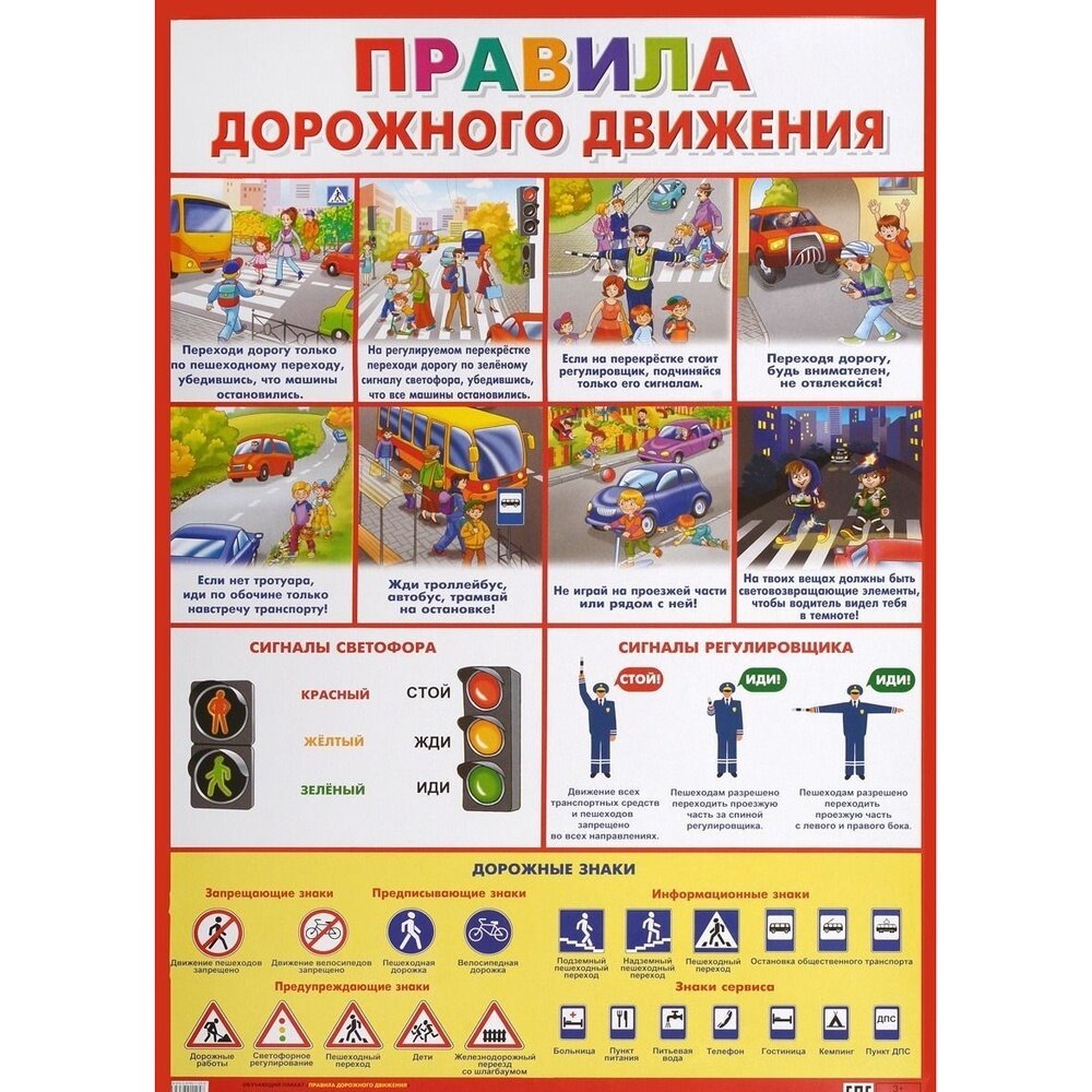 Обучающий плакат "Правила дорожного движения" познакомит детей с основными правилами, которые необходимо соблюдать пешеходу, а также с сигналами светофора и регулировщика, основными дорожными знаками.
