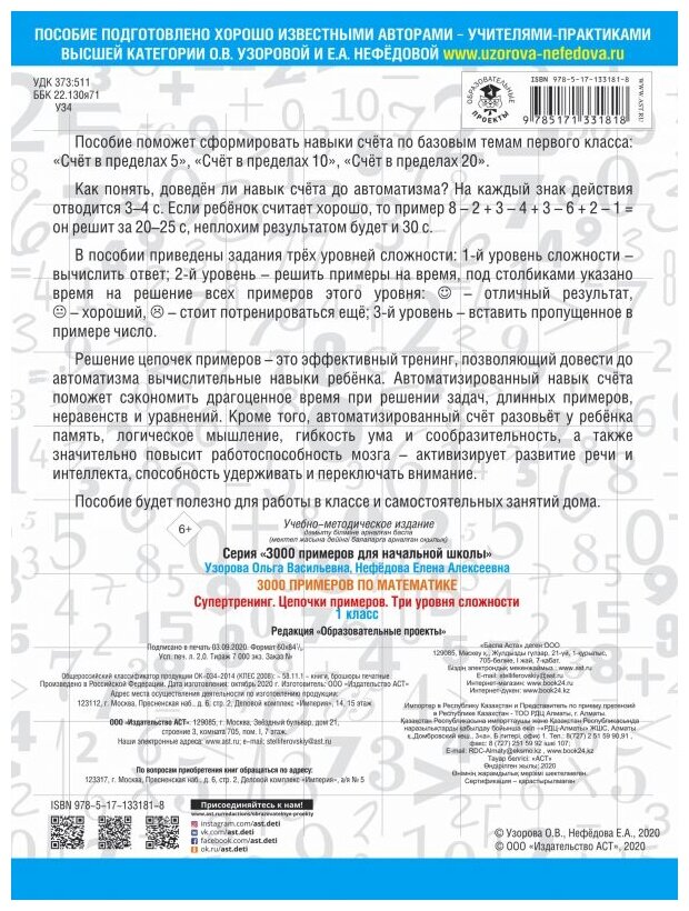 3000 примеров по математике. Супертренинг. Цепочки примеров. Три уровня сложности. 1 класс (Елена Алексеевна Нефедова, Ольга Васильевна Узорова); АСТ, 2020