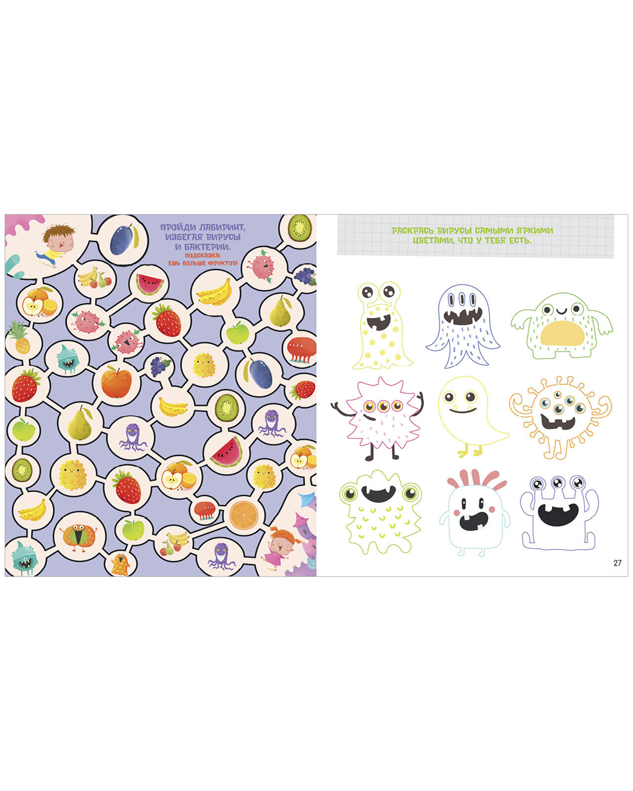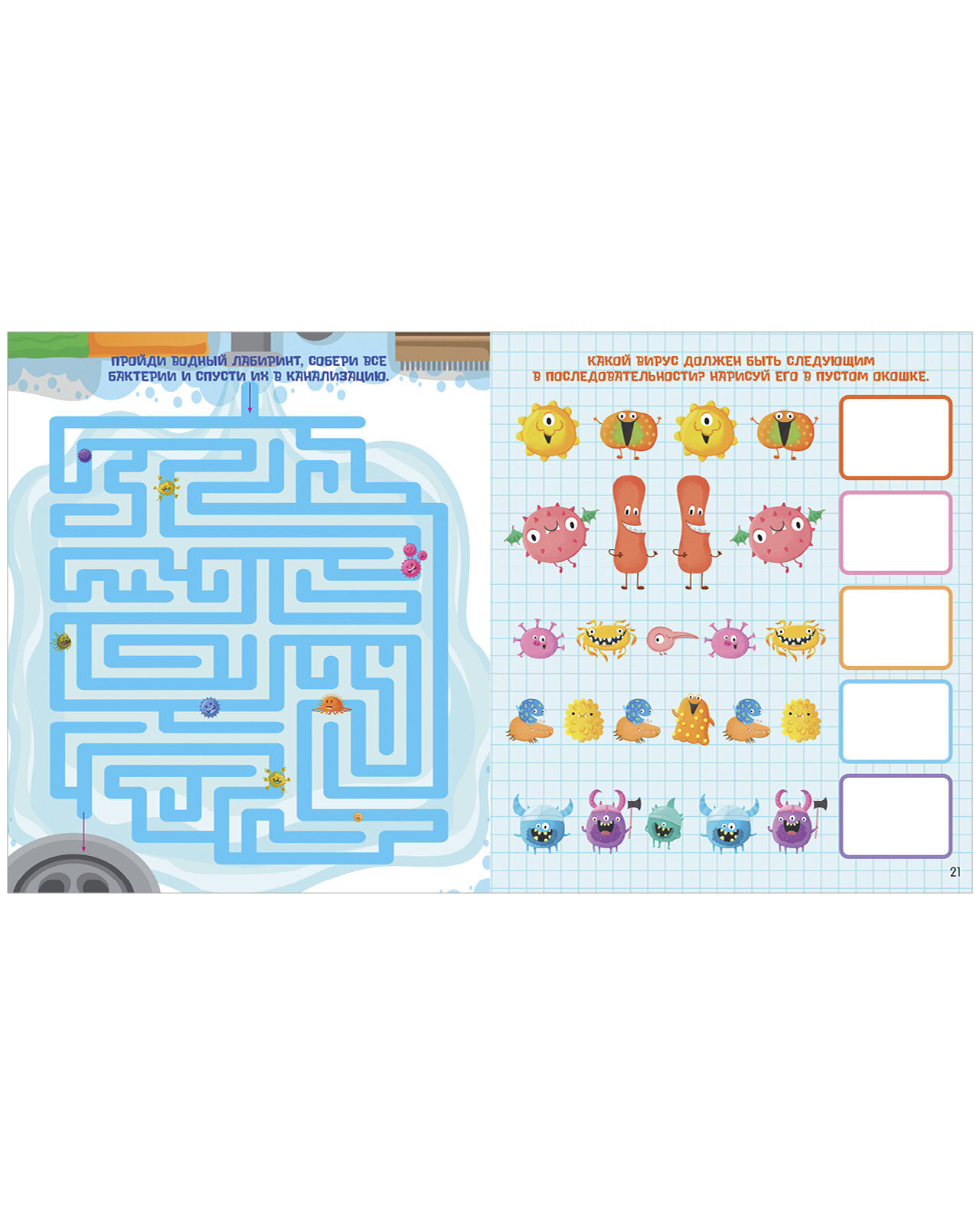 Эта книжка-активити в легкой игровой форме познакомит ребенка с вирусами и бактериями. А увлекательные задания, игры, раскраски и головоломки займут его не на один час.