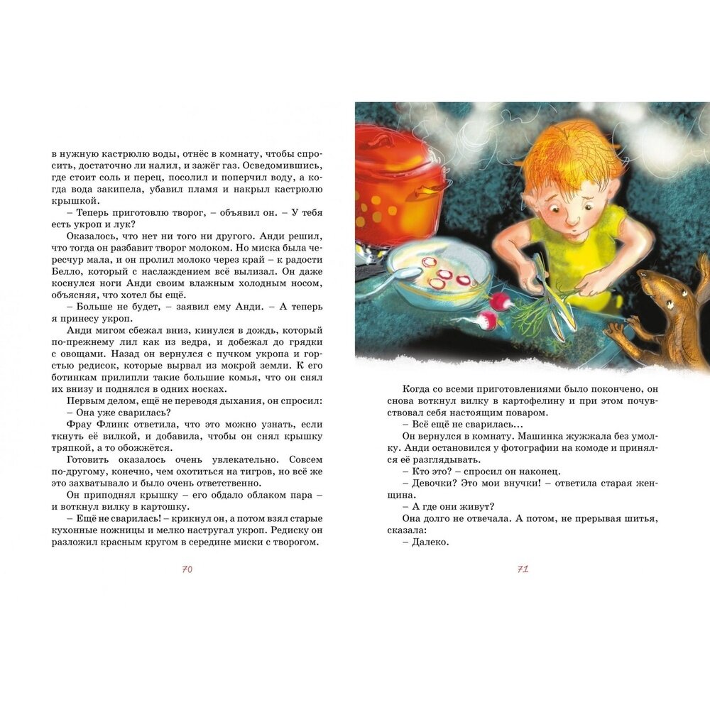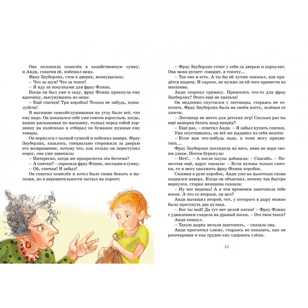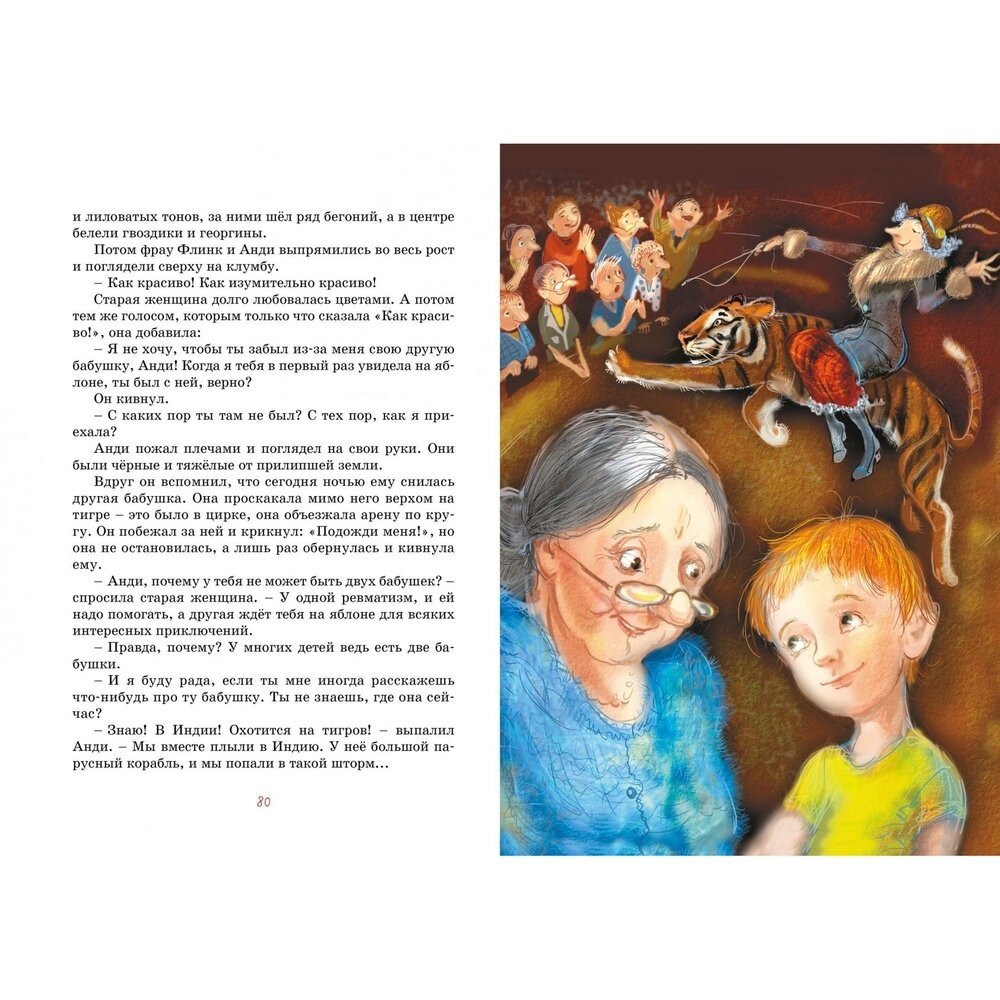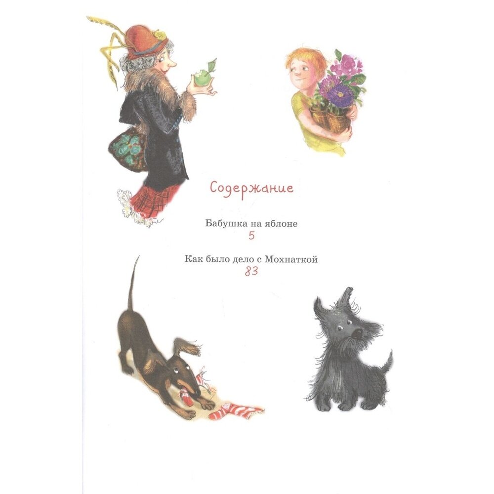 Покупала книгу для детей 10 лет. Детям книга очень понравилась. Читали ее на летних каникулах. Всего в книге две фантастические истории. Написала их австрийская писательница. Одна история - Бабушка на яблоне, а вторая - Как было дело с Мохнаткой. В первой истории рассказывается об одиноком мальчике, который мечтал, чтобы у него была бабушка. А вторая история повествует о собаке Мохнатке. Книга небольшая по формату, крупный шрифт, белые плотные листы, иллюстрации красивые, практически, на каждом развороте. Имеется закладка - ляссе. Единственное, что мне не понравилось - интегральная обложка. Она не твердая, и не мягкая.