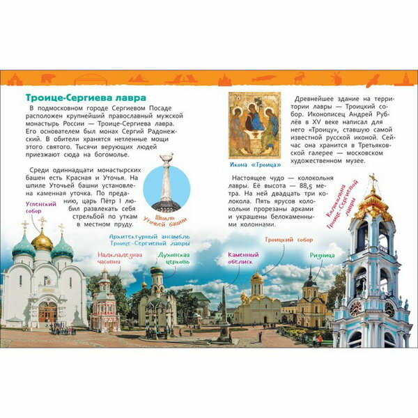С энциклопедией "Чудеса России" ребёнок может отправиться в виртуальное путешествие по нашай стране. В книгу вошёл рассказ о достопримечательностях Крыма. Отдельный раздел посвящен такому красивому городу, как Санкт-Петербург и путешествию по "Золотому кольцу". Интересная глава про Дальний Восток. Таким образом, даже без поездок ребёнок может благодаря этой энциклопедии получить знания про чудеса России.