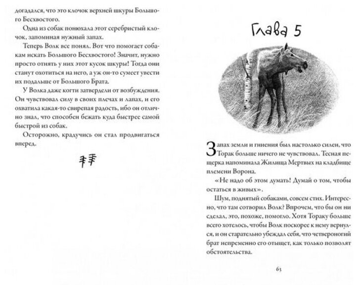 Четвёртая часть уже больше похожа на психологический триллер, нежели на детский роман (хотя и первая часть изобилует такими сценами жестокости, что детям я бы её читать не стала). Здорово выполнен, но плохо объяснен переход Торака в депрессивное состояние и обратно: смысл - то понятен, но почему произошло именно так, не совсем ясно. Понравились три новых персонажа - животных, давно было пора ввести кого-то, кроме волка. В целом, добротное чтиво о подростковых душевных метаниях на фоне природы каменного века.