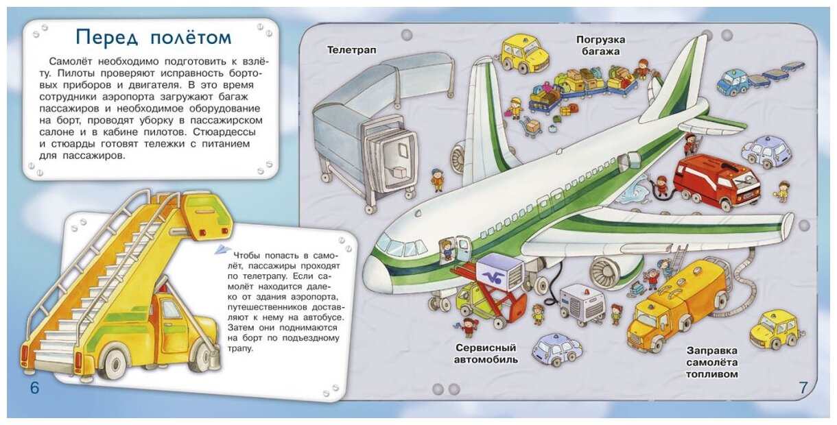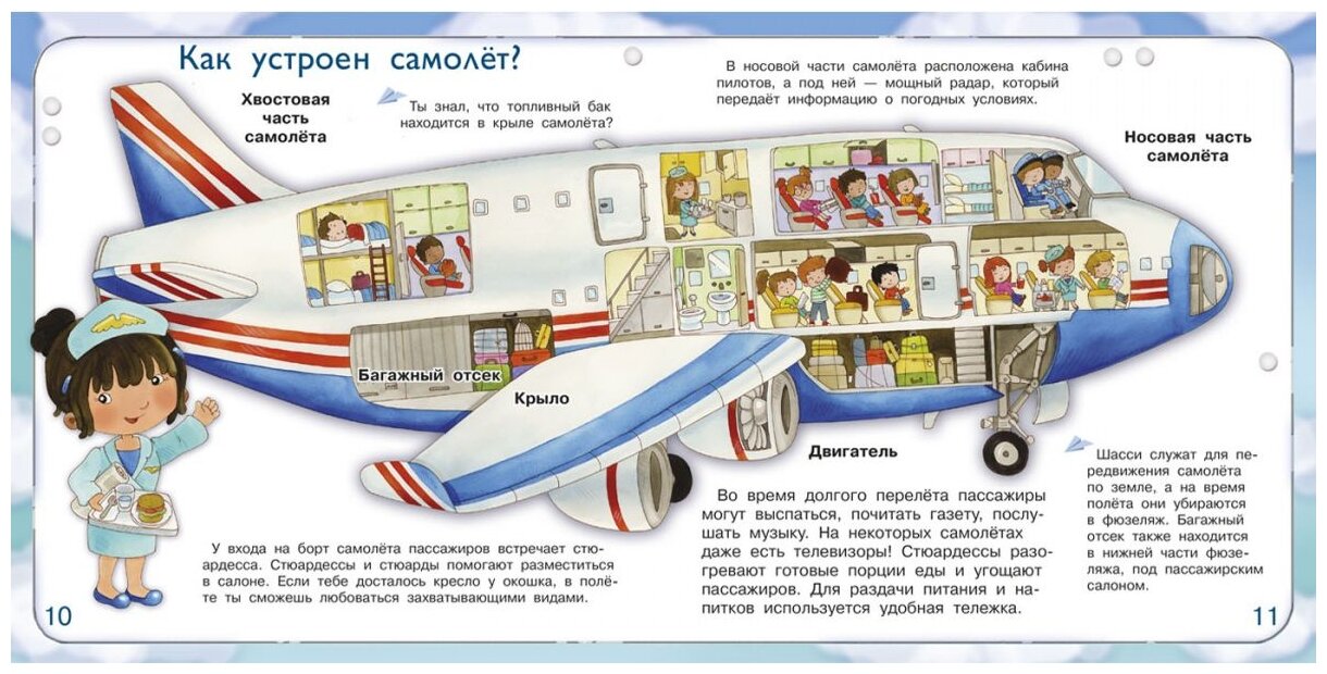 В первую очередь, понравился небольшой формат книги. Издание не займёт много места и поместится в руках у ребёнка. Страницы плотные, не рвутся. Много развивающего текста и познавательных иллюстраций внутри. В книге интересно рассказывается о том, как устроен самолёт. О том, что экипаж должен сделать перед рейсом. Книга оправдывает своё название, так как после её прочтения ребёнок сможет себя маленьким авиатором.