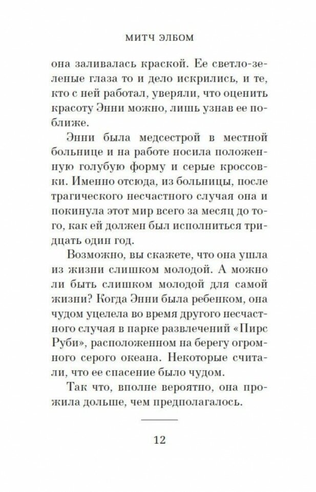 Я прочла все три произведения Митча Элбома, могу сказать, что это шедевр! Я аплодирую стоя автору 👏 прорыдала я всю книгу, начала читать и не смогла остановиться.
