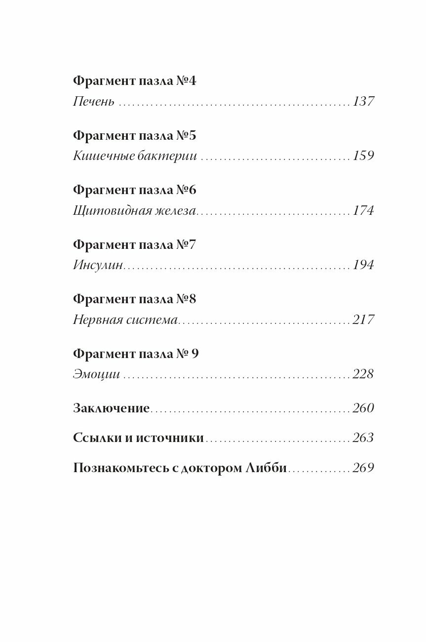 В своей новой книге она рассказывает, как перестать расстраиваться из-за неприятной цифры на весах и создать условия для того, чтобы ваш организм начал сжигать жир. На основании холистического подхода к здоровью доктор Либби выделяет девять факторов, влияющих на изменение веса: эмоции, калории, гормоны стресса, половые гормоны, кишечные бактерии, инсулин, состояние печени, щитовидной железы и нервной системы.