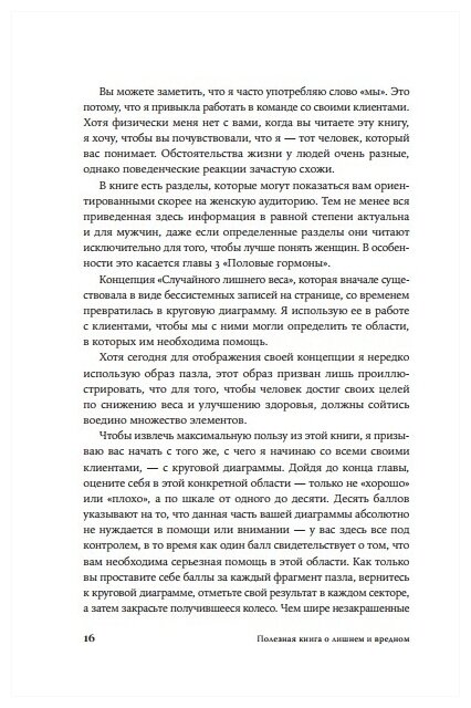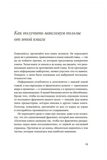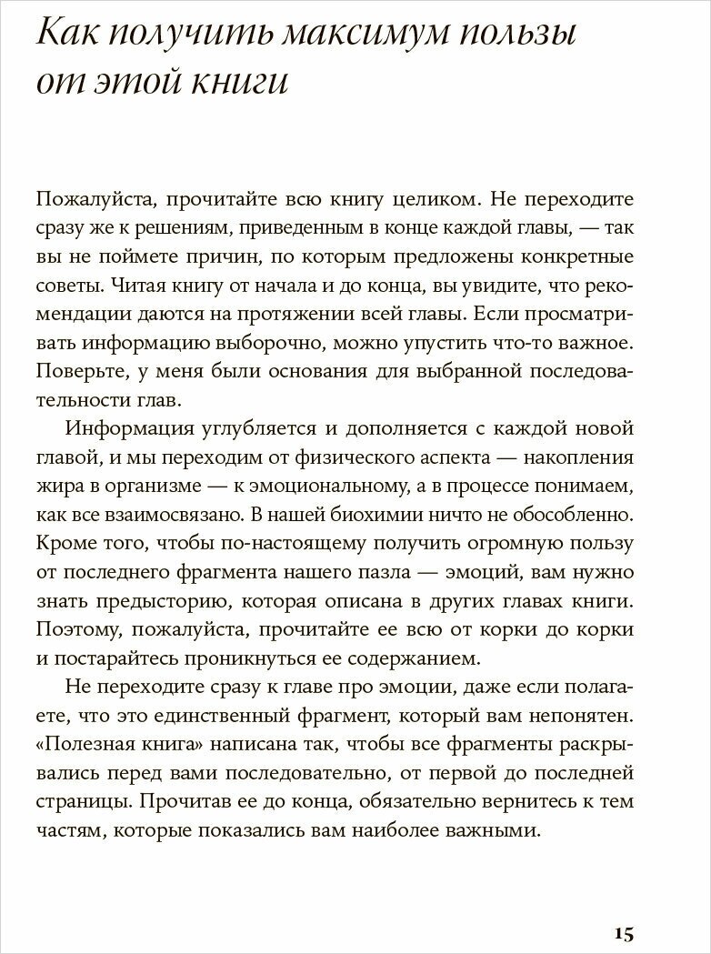 Чудесная книга о том, как следить за своим питанием и не превращать это в пытку. Это книга именно о питании и о том, какое влияние оно оказывает на наш организм, не о похудении, и писательница не раз предупреждает: она никогда не просит своих пациентов становится на весы, потому что таким образом они измеряют свою самооценку. Здесь подробно рассказывается о том, как следить за своим организмом и как делать это без лишних мучений и ненависти к себе. Например, зачем нужно раздельное питание и как его ввести, чтобы вы через несколько дней не сказали себе, что вас это достало. Как влияет кофе или алкоголь на организм и нужно ли сдерживаться в употреблении каких-то продуктов или нет.