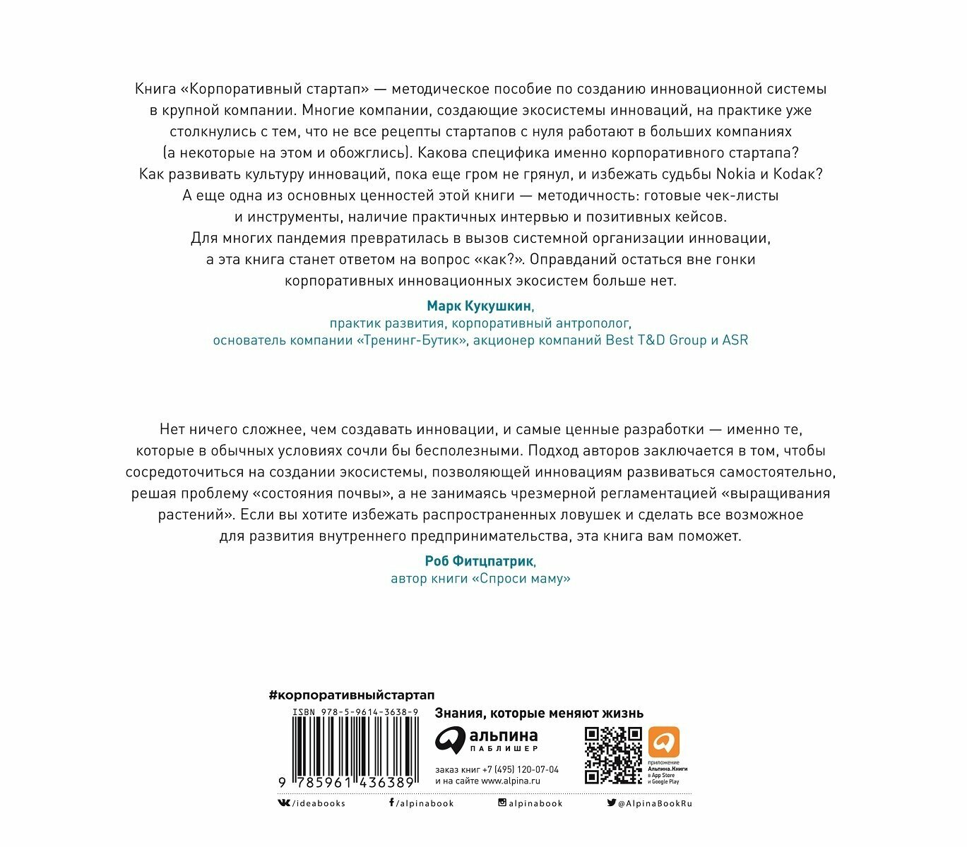 В книге «Корпоративный стартап» предлагается подробный план действий, руководствуясь которым любая компания сможет начать процесс преобразований. Авторы рассказывают о проверенной методике создания инновационной экосистемы с применением принципов бережливого стартапа, построения бизнес-моделей, развития потребителей и дизайн-мышления.