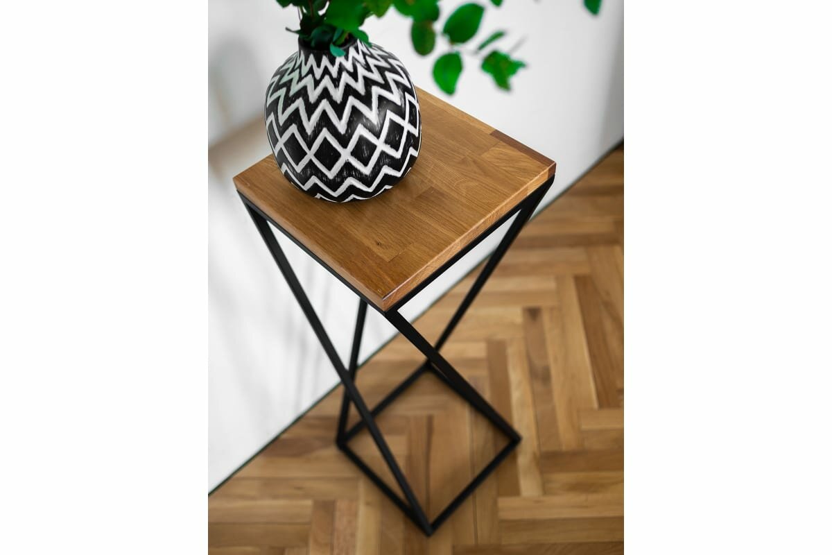 Неразборная конструкция. Столешница из бука толщиной 2 см. Размер столешницы 30х30 см. Подходит под горшки, кашпо, а также для других интерьерных решений. Для напольной установки.