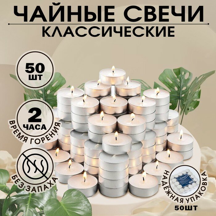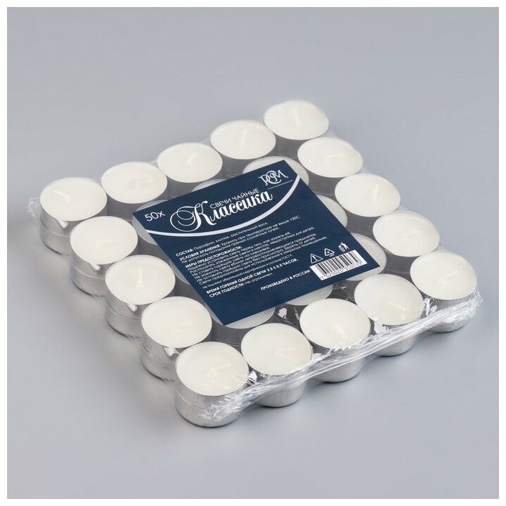 5502955 Набор чайных свечей "", 50 штук Используйте восковую свечу в гильзе как самостоятельный декоративный элемент или поставьте её в фонарь или аромалампу. Также свечи в гильзе используются для подогрева горячих напитков и первых блюд. Зажгите свечу, поместите её в специальную подставку и установите сверху чайник или блюдо. Температуру подогрева можно регулировать количеством свечей. В результате пища или напиток не остынет, а живой огонь создаст уютную атмосферу.