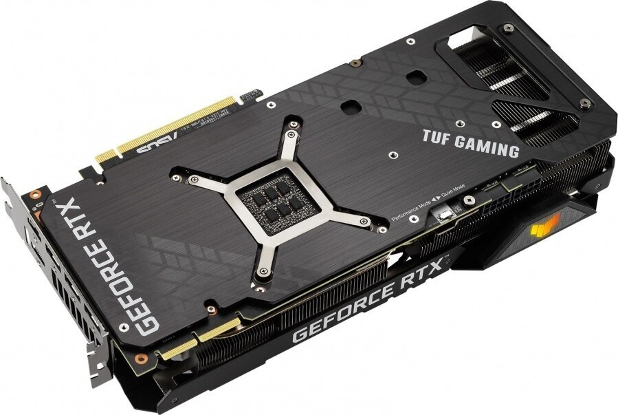 Теплораспределитель отводит тепло к тепловым трубкам, которые переносят его через стек ребер, которые занимают большую часть большой площади карты, занимающей 2,7 слота. Это поколение видеокарт TUF Gaming также оснащено специальным радиатором для VRAM, чтобы поддерживать температуру в пределах максимальных рабочих характеристик.