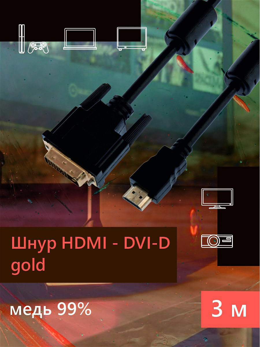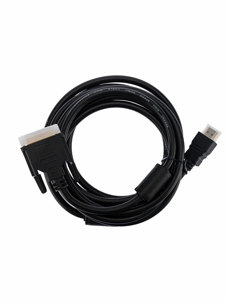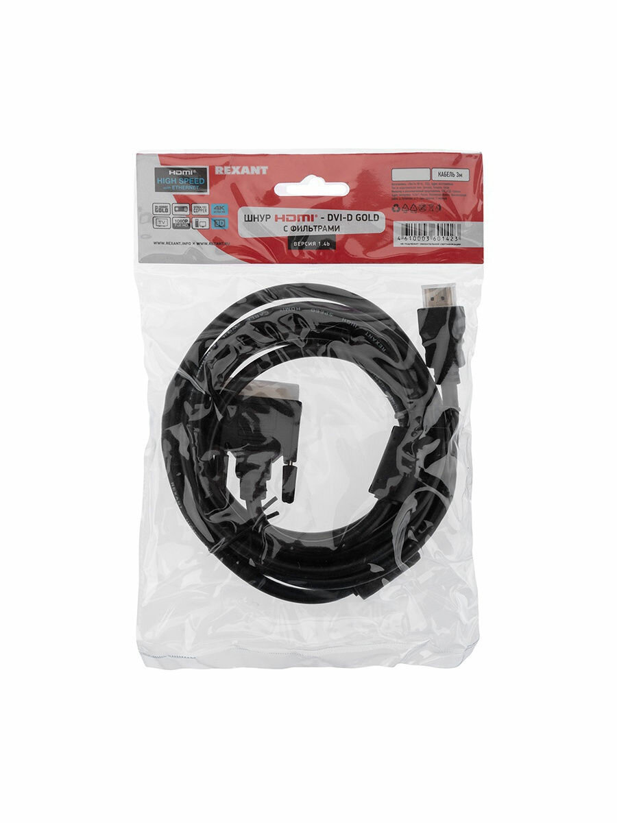 Шнур HDMI — DVI-D gold 3М с фильтрами REXANT предназначен для передачи цифрового видеоизображения высокого разрешения и многоканального аудио сигнала. Используется для совместной работы устройств, имеющих разъемы DVI-D и HDMI: проекторы, телевизионные аппараты, компьютеры и ноутбуки, мультимедийные проигрыватели и других видеоустройствах. С одной стороны располагается штекер разъема HDMI (High-Definition Multimedia Interface — интерфейс для мультимедиа высокой чёткости), а с другой штекер разъема DVI (Digital Visual Interface, сокр. DVI (англ. цифровой видеоинтерфейс)). Отличительной особенностью является наличие ферритовых фильтров, которые увеличивают индуктивность проходящего через него участка провода в несколько сотен раз, это обеспечивает подавление помех высокой частоты. Ферритовые кольца на шнуре используются как дополнительные внешние фильтры и обеспечивают воспроизведение абсолютно точного оригинального сигнала. Для производства жил используется только первичная, технически чистая медь (99%). На контакты разъемов нанесен слой золота по технологии вакуумного напыления, обеспечивающий повышение качественных показателей изображения и звука, а также отсутствие помех при передаче сигналов. Штекеры выполнены из легкого и прочного пластика.