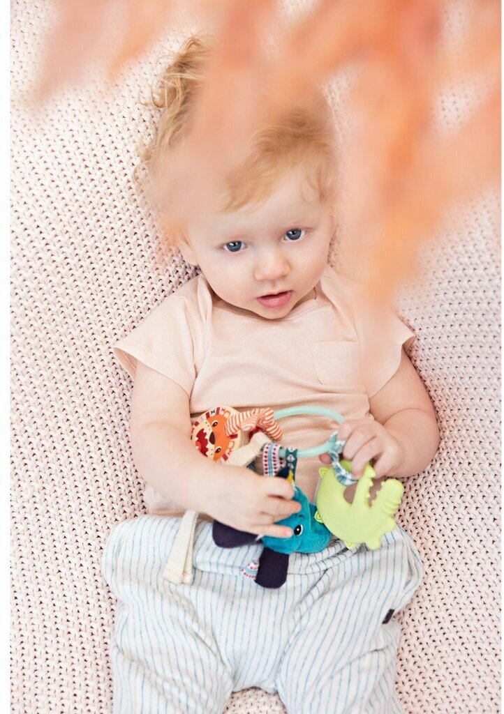 Игрушку легко закрепить при помощи специальных завязочек к кроватке, люльке, игровому коврику, коляске и она станет постоянным спутником вашему малышу.