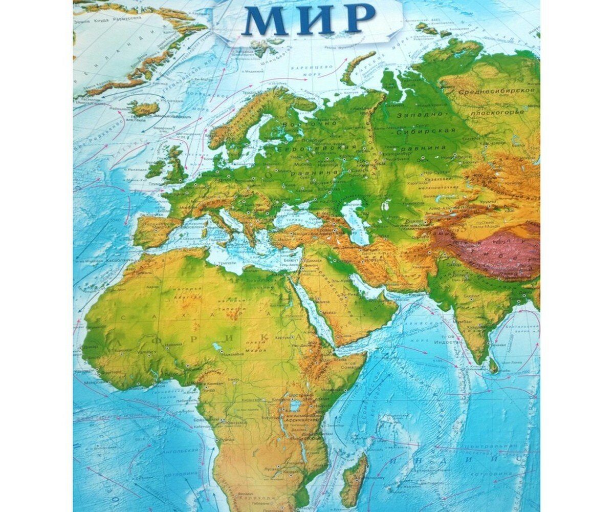 Физическая карта "Мир". Цветом показан рельеф суши и морского дна. Названия континентов и населенных пунктов.