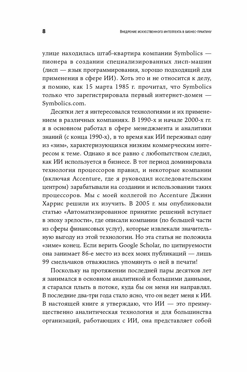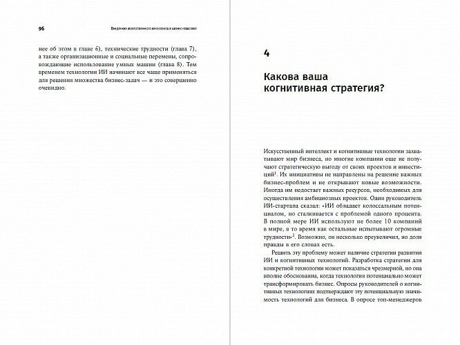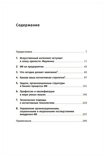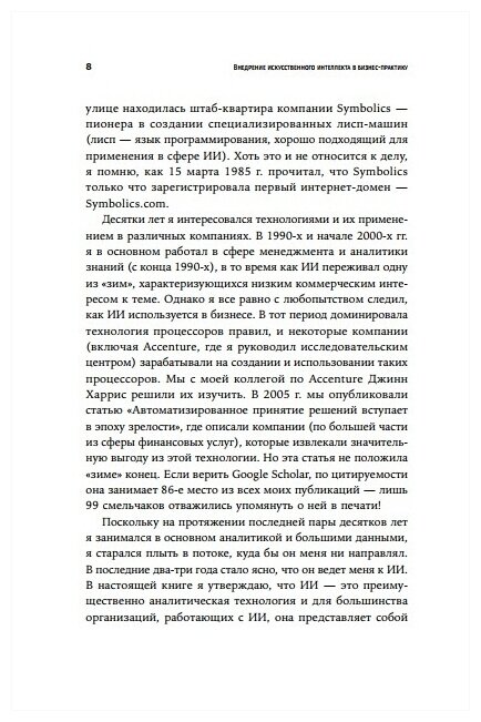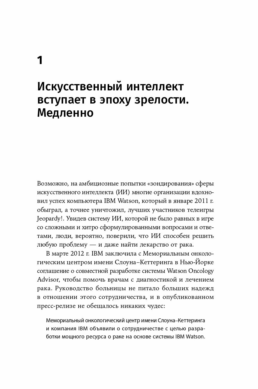 Он подробно рассматривает преимущества и сложности внедрения различных видов технологий: статистическое машинное обучение, нейронные сети, глубокое обучение, обработку естественного языка, экспертные системы на основе правил, роботов и роботизированную автоматизацию процессов. И приводит примеры как успешного, так и неудачного использования ИИ в разных компаниях: Amazon, Google, Facebook, GlaxoSmithKline, Uber, GE, цифровом банке DBS и др.