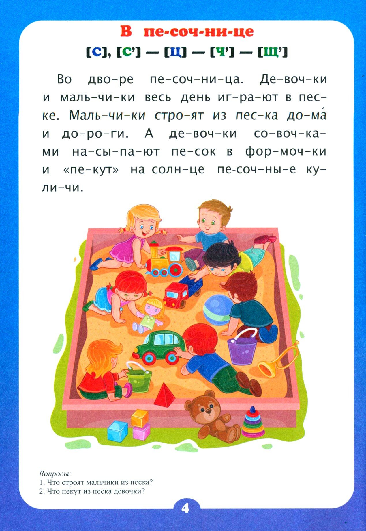 На каждой странице один рассказ с картинкой и вопросами к тексту. Рассказы небольшие, понятные и близкие для ребенка: про песочницу, про игрушки. Всего 14 рассказиков. Шрифт не маленький, межстрочный интервал не маленький. Рисунки добрые и яркие.