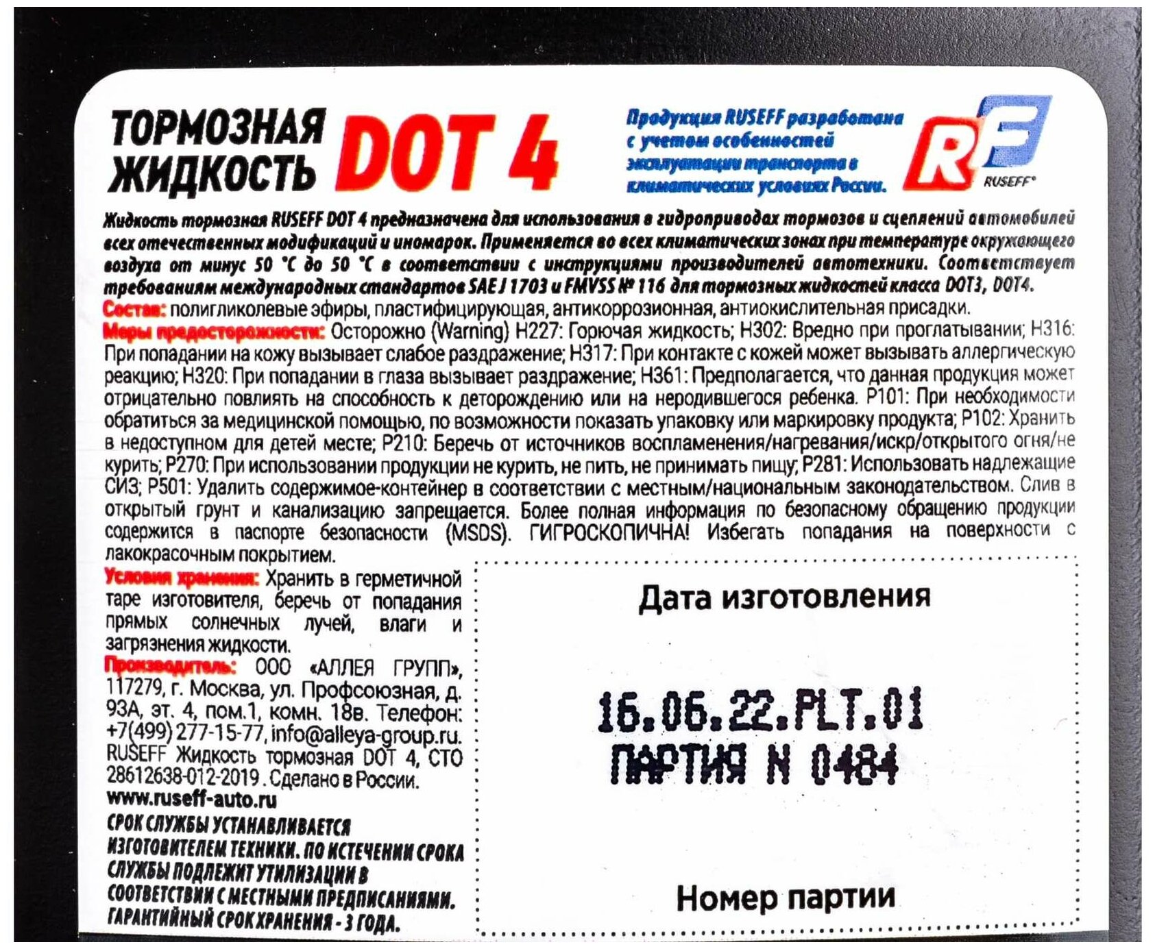 Тормозная жидкость DOT4 RUSEFF - высококипящая маловязкая синтетическая тормозная жидкость с улучшенными характеристиками, рассчитанными на работу в автомобилях с дисковыми и дисковыми вентилируемыми тормозами - превосходный отечественный продукт. Она разработана в соответствии с международными стандартами SAE J 1703 и FMVSS № 166 для тормозных жидкостей класса DOT 3, DOT 4 и предназначена для использования в гидроприводах тормозных систем и сцеплений автомобилей всех отечественных модификаций и иномарок. Жидкость создана по современной технологии на основе смеси эфиров гликолей с высокоэффективными присадками и ингибиторами коррозии. С учетом обеспечения стабильности необходимых характеристик при езде в условиях города, в постоянном режиме старт-стоп, а также при быстрой езде, когда тормозная система может сильно нагреваться. Обеспечивает прокачку по тормозной системе, быстродействие антиблокировочных тормозных систем и систем стабилизации движения. Тормозная жидкость DOT4 RUSEFF совместима с другими жидкостями, соответствующими спецификациям DOT 3, DOT 4. Рекомендовано к применению на всей территории России во всех климатических зонах при температуре окружающей среды от -50С до + 50С в соответствии с инструкциями производителей автотехники. Свойства: синтетическая маловязкая тормозная жидкость на основе гликольэтеров и эфиров борной кислоты. Содержит ингибиторы коррозии и антиоксиданты. Обеспечивает прокачку по тормозной системе, быстродействие антиблокировочных тормозных систем и систем стабилизации движения. Имеет стандартный срок службы. Использование RUSEFF DOT 4 cохраняет работоспособность тормозных систем в широком интервале температур. Применение: использовать в соответствии с рекомендациями производителя автотехники. Последовательность и особенности замены тормозной жидкости, например прокачка с работающим двигателем, зависят от конструкции системы тормозов (типа усилителя, наличия антиблокировочных устройств и т.п.). Обычно такая информация есть в руководстве по эксплуатации автомобиля. Тормозные жидкости различных классов в основном