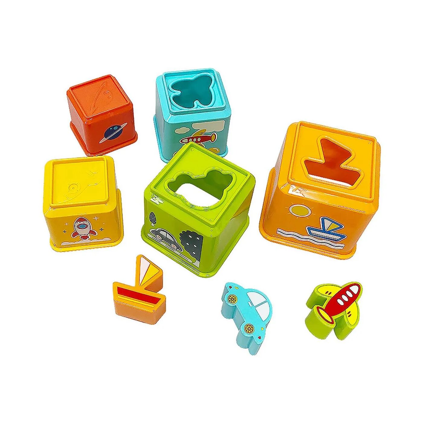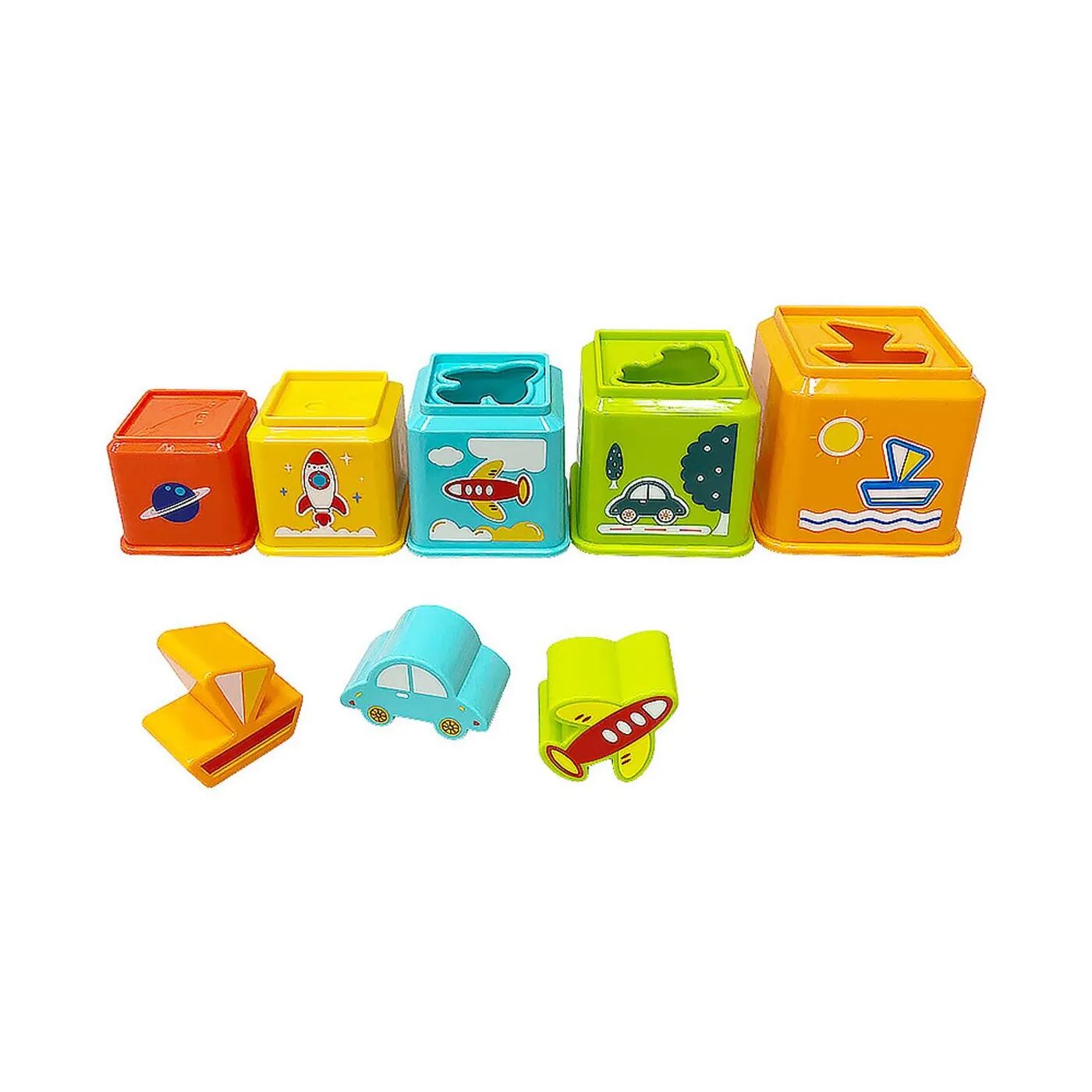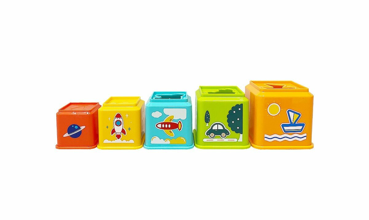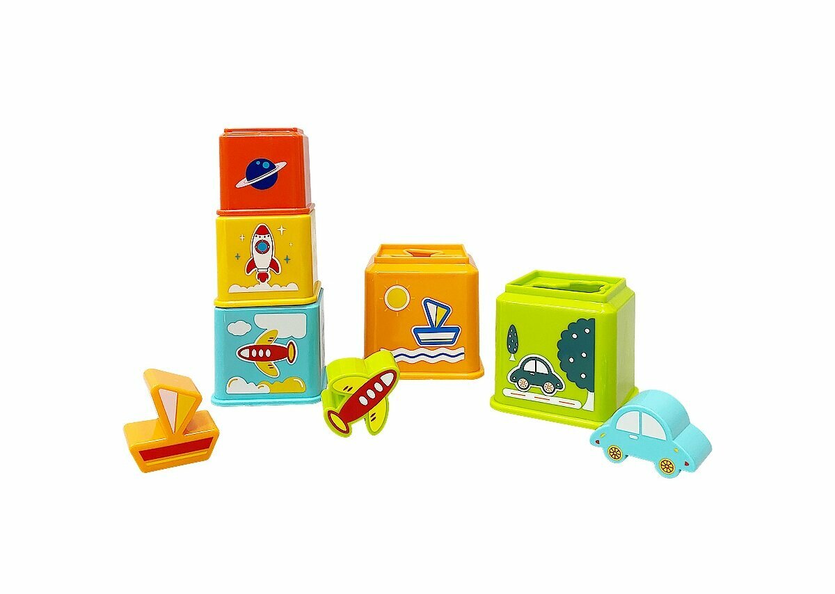 Игрушка состоит из 5-ти кубиков, 3 из которых имеют специальные отверстия (кубики-сортеры), а также 3-х фигурок для сортера (самолетик, машинка, кораблик). Нижняя часть пирамидки состоит из блоков-сортеров, в которые можно вкладывать подходящие фигурки по мере ее построения, делая игру более интересной и увлекательной для малыша.