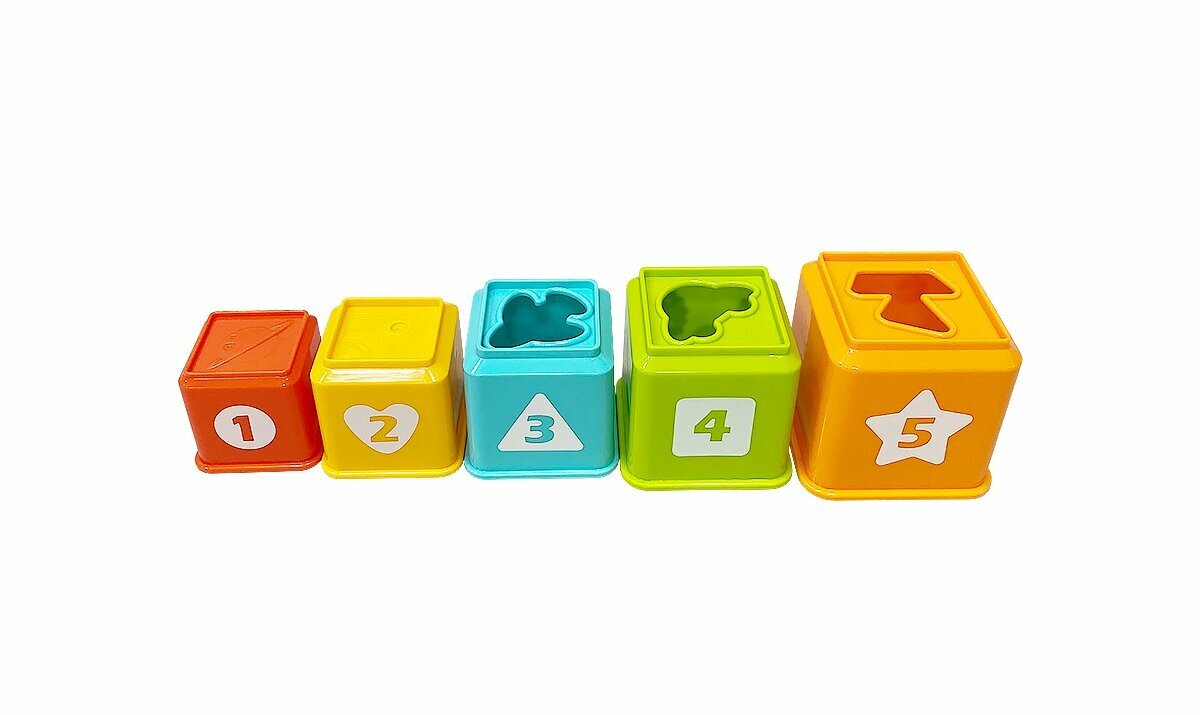 На каждом из кубиков указано число от 1 до 5 включительно — это позволит ребенку познакомиться с цифрами и правильно проследить очередность построения пирамидки.