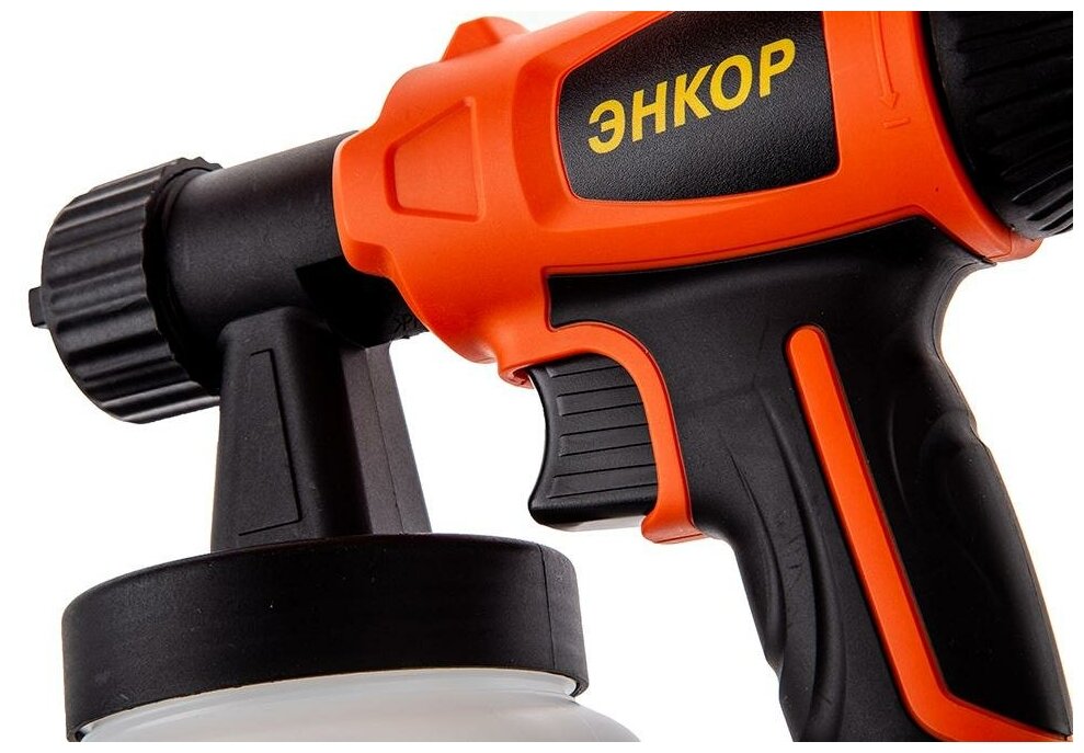 Устройство Энкор представляет собой стандартный краскопульт, отличающийся применением привода высокой мощности. Такая особенность дает ему возможность работать с достаточно вязкой краской, а также окрашивать большие поверхности за небольшое время. Кроме того, модель стоит приобрести ради использования очень удобного бачка с достаточно большой емкостью - он также существенно повышает результативность применения инструмента.