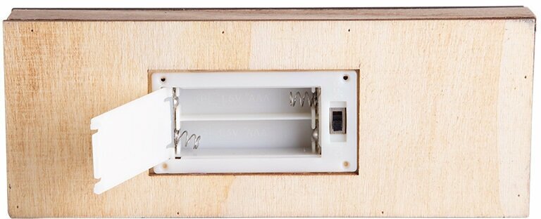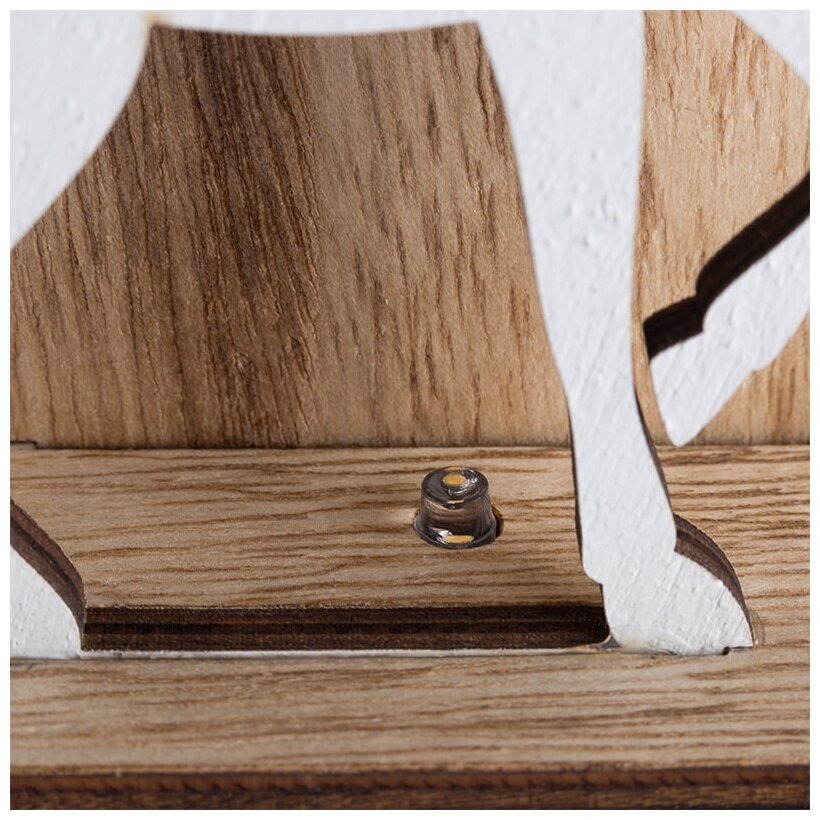 Деревянная фигурка с подсветкой «Елочка с оленем» 18×7×29 см — оригинальный интерьерный декор, который подчеркнет уникальный стиль обстановки. Трехслойная композиция выполнена из листовой древесины с аутентичной фактурой. На переднем плане находится резная фигурка оленя белого цвета. Между декоративными элементами располагаются экономичные диоды, которые мягко подсвечивают экспозицию — общее количество светодиодов 5 штук. Изделие работает от 2 батареек типа ААА, что делает его независимым от стационарной розетки.